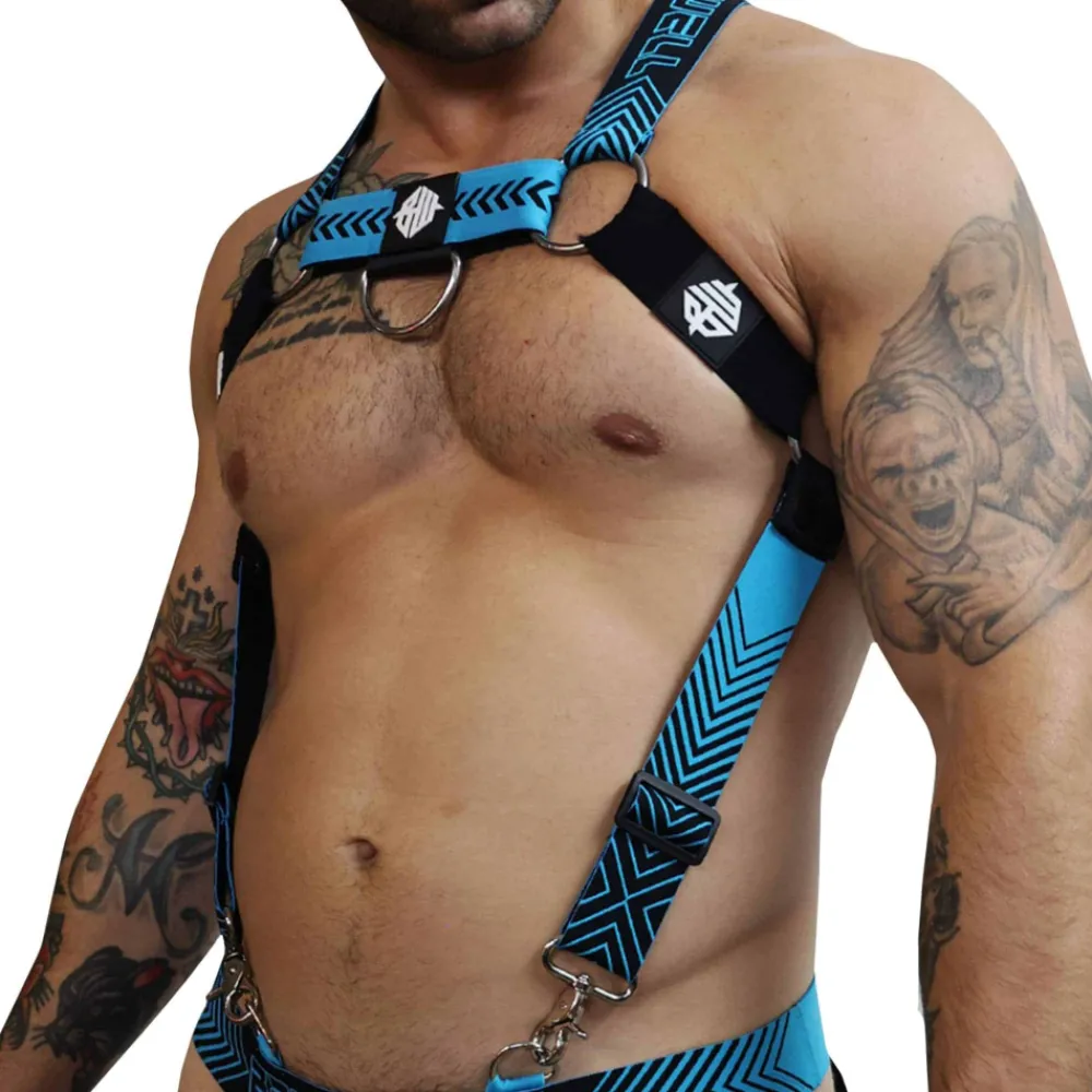 Harnais sexy composé de bandes élastiques ajustables décorées d’un motif à chevrons. Patchs Breedwell en PVC de qualité supérieure. 6 anneaux métalliques. Bande horizontale amovible sur la poitrine. Peut être attaché au jock strap ou au string Futura (vendus séparément) grâce à 2 mousquetons.