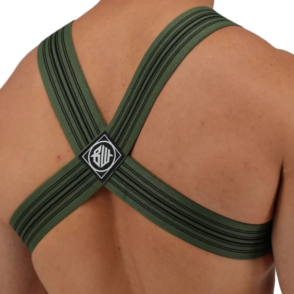 Harnais sexy constitué de bandes élastiques larges formant un X dans le dos. Devant, la forme en H met en valeur vos pectoraux. Patch Breedwell à l’avant avec anneau métallique.