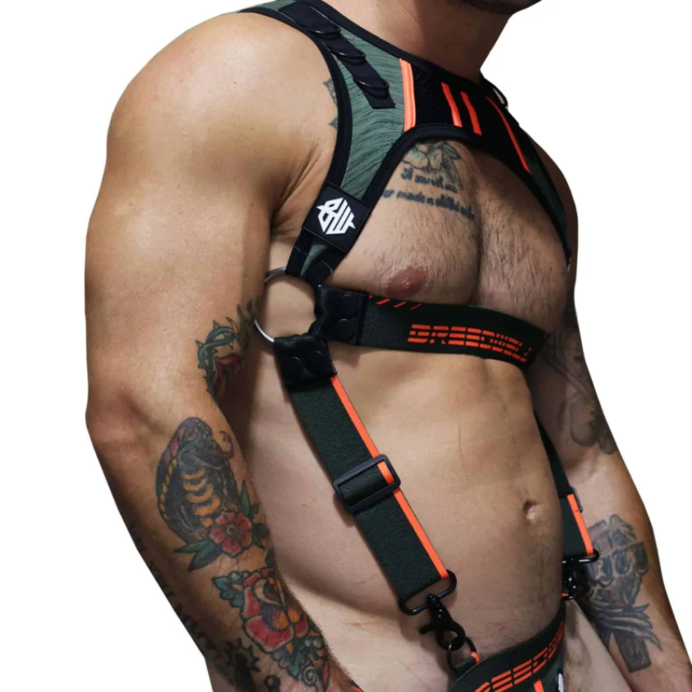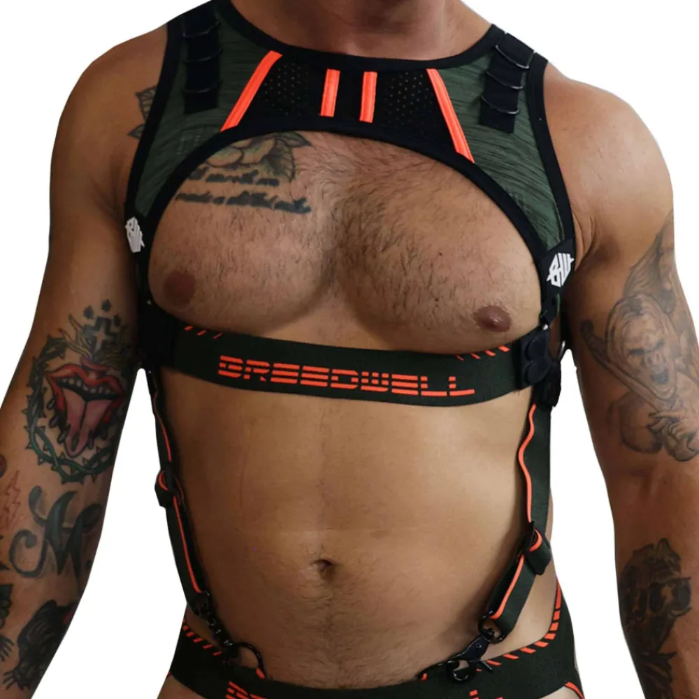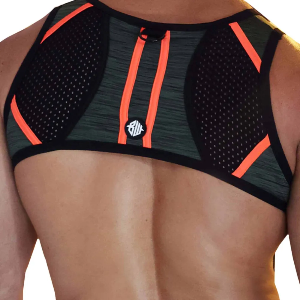 Harnais sexy en microfibre chinée. Peut être attaché au boxer jock chock ou au jock strap Cockpit (vendus séparément) grâce à 2 mousquetons. Détachez les sangles latérales et sous la poitrine et le harnais devient un crop top. Empiècements en mesh. Patchs Breedwell en PVC de qualité supérieure. Anneaux métalliques.