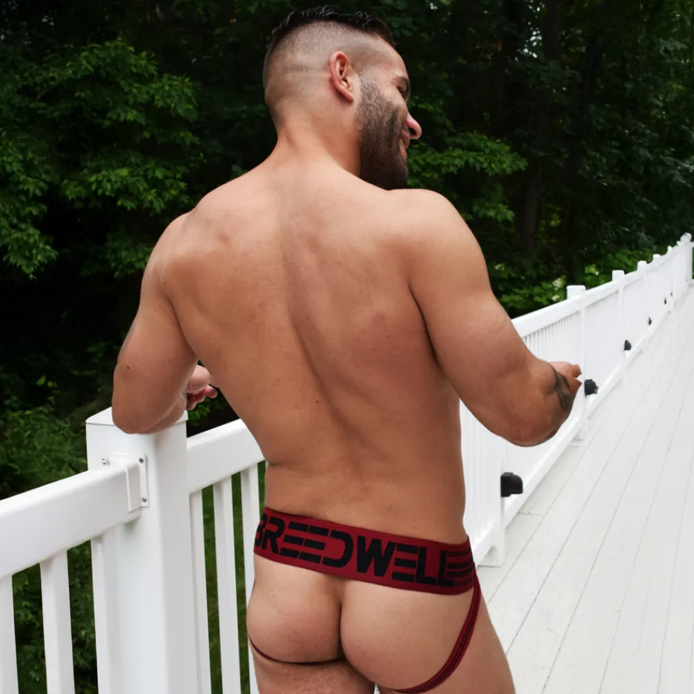 Jockstrap old-school en tissu extensible tricoté. Poche frontale profonde. Ceinture élastique extra-large signée Breedwell.