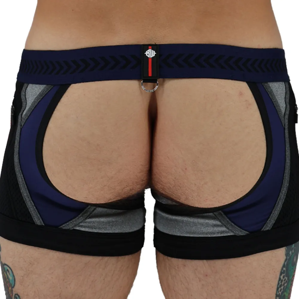 Sous-vêtement au design original et provocant combinant un jockstrap et un boxer. Conçu en jersey épais et doux de qualité supérieure. Bandes contrastées et empiècements latéraux en résille soulignent le volume de la poche frontale. Poches latérales zippées en mesh. Ceinture élastique décorée d’un motif à chevrons. Anneaux métalliques pour attacher un harnais body (vendu séparément). Patchs Breedwell en PVC.