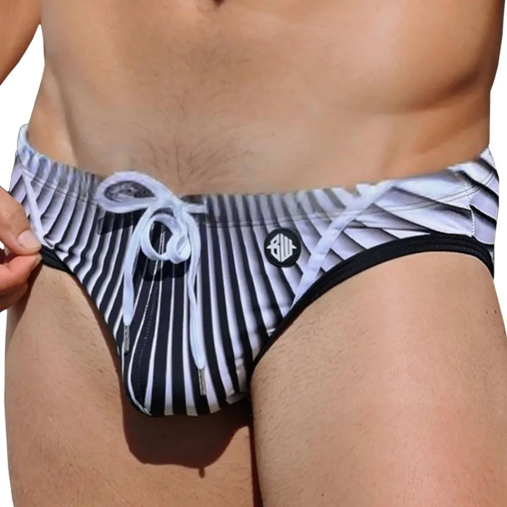 Slip de bain taille basse en microfibre douce et confortable. Imprimé provocant qui attire le regard et souligne le galbe des fesses. Bande sport contrastée sur le côté. Ceinture élastique avec cordon de serrage. Poche frontale doublée. Patch Breedwell en PVC.