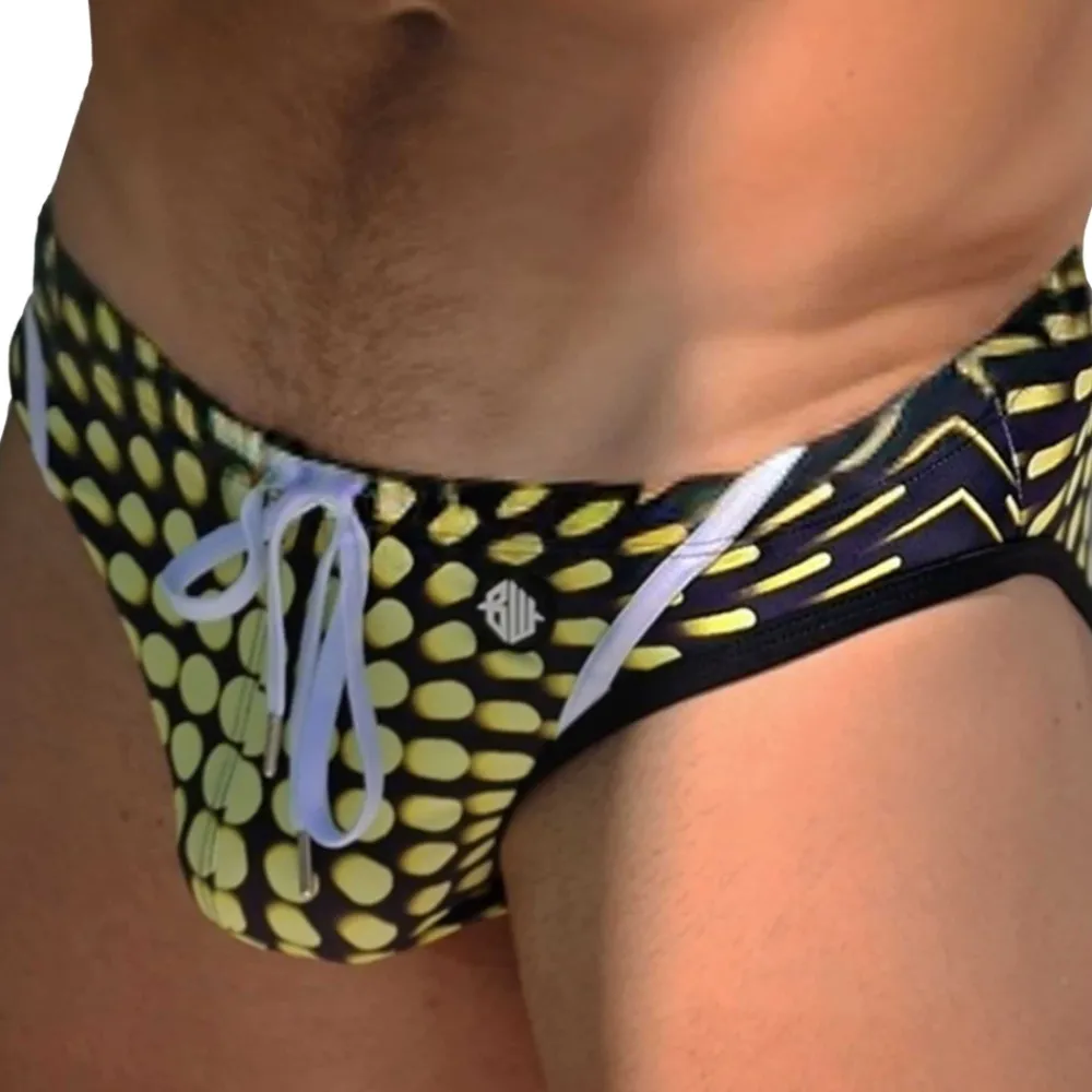 Slip de bain taille basse en microfibre douce et confortable. Imprimé 3D original qui valorise votre anatomie. Bande sport contrastée sur le côté. Ceinture élastique avec cordon de serrage. Poche frontale doublée. Patch Breedwell en PVC.
