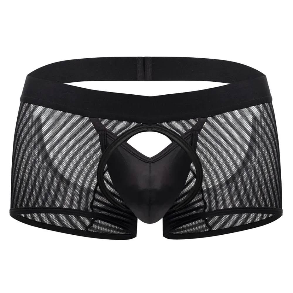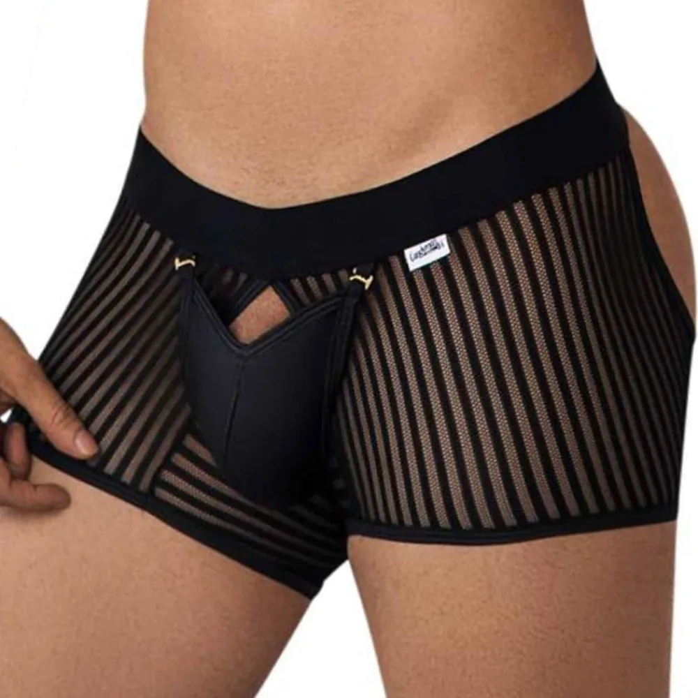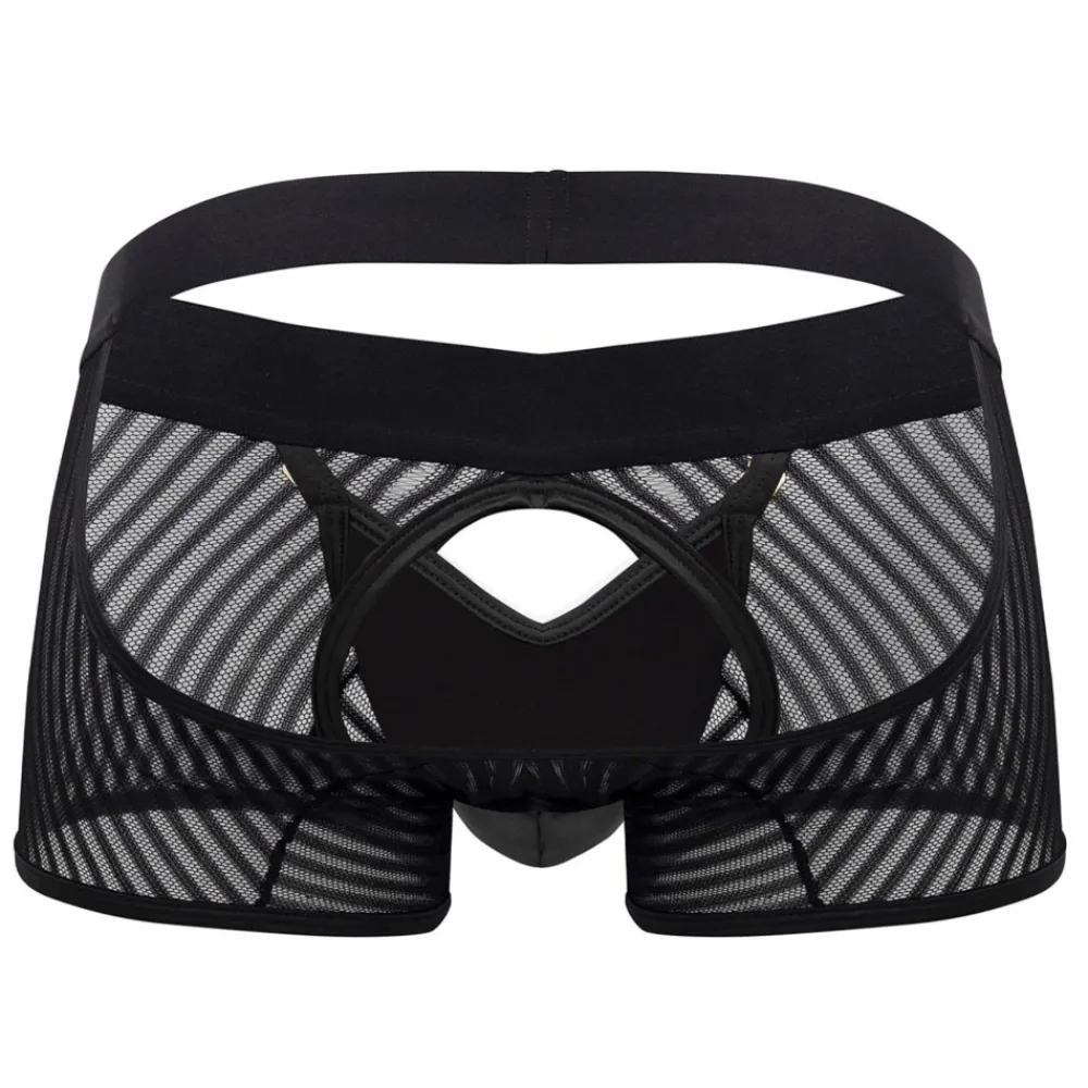 Boxer sexy et provocant en résille rayée transparente. Poche frontale opaque qui s’ouvre grâce à 2 crochets métalliques. Découpe sur les fesses pour une totale liberté de mouvement.