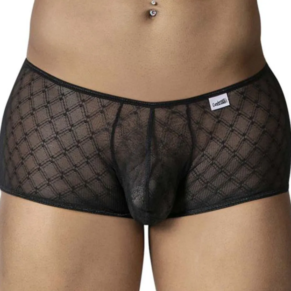 Mini boxer très sexy en résille extensible semi-transparente, ornée d’un motif géométrique. Coupe minimaliste, taille basse et ajustée. Poche frontale préformée, non doublée. Fine ceinture élastique.