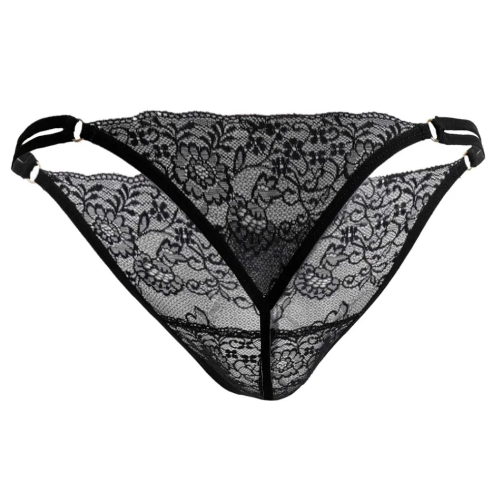 String taille basse, sexy et provocant, en dentelle transparente. Fines bandes élastiques attachées par de petits anneaux dorés sur les côtés.