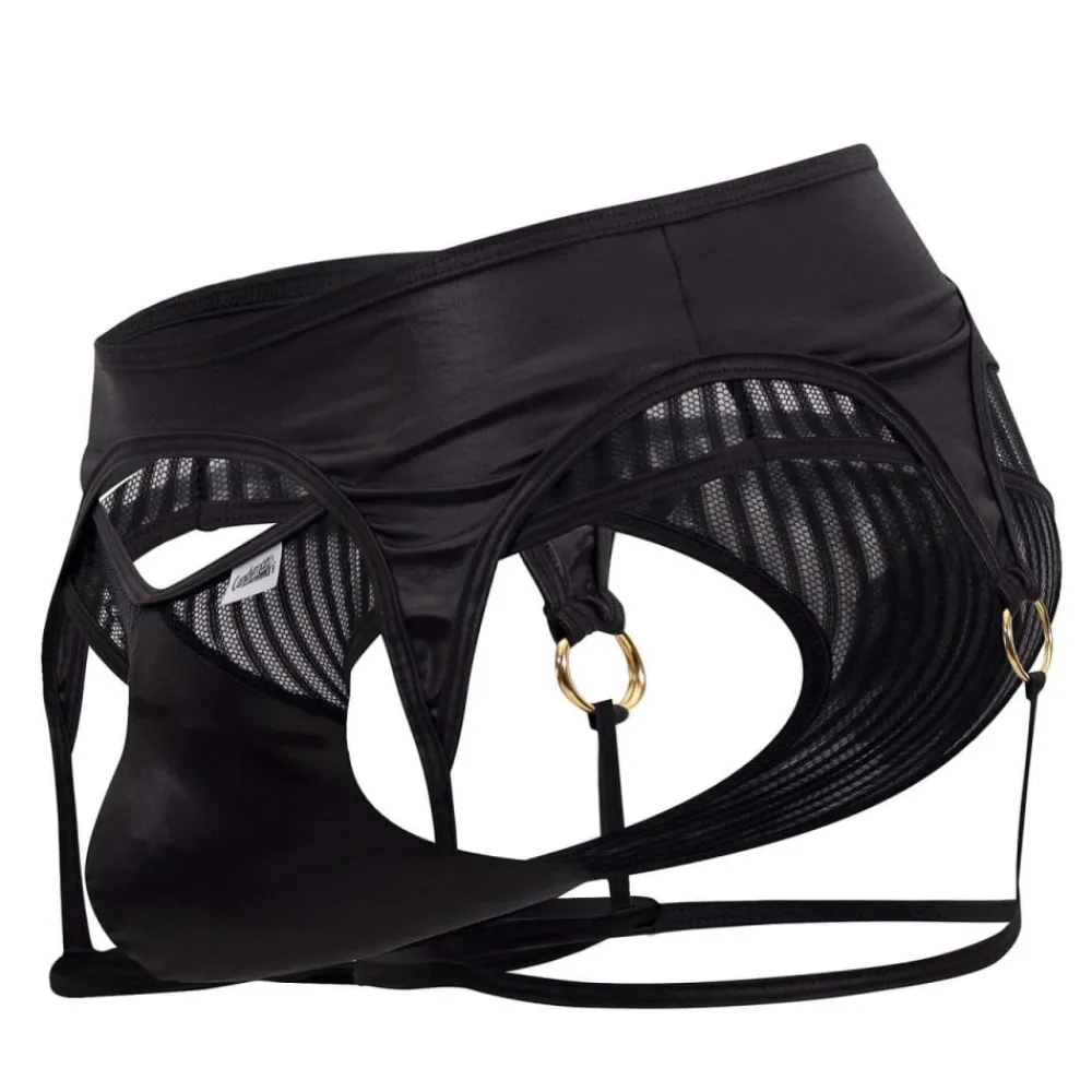 String très sexy en voile rayé semi-transparent. Jarretière en microfibre stretch avec fines bretelles et anneaux en métal. Poche frontale opaque, préformée et non doublée.