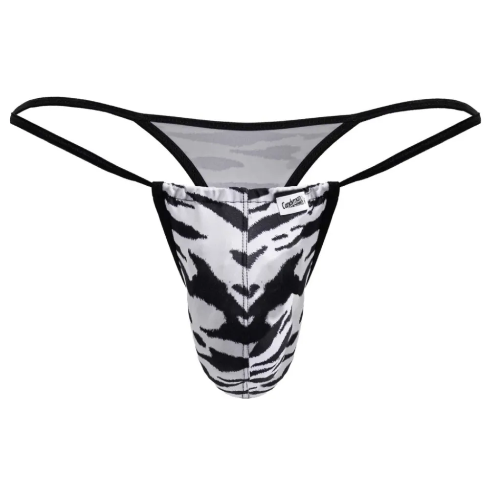 String provocant en microfibre ultra extensible, douce et légère, imprimée d’un motif zèbre. Coupe minimaliste, taille basse et ajustée. Poche frontale non doublée, coulissant sur la fine ceinture élastique.