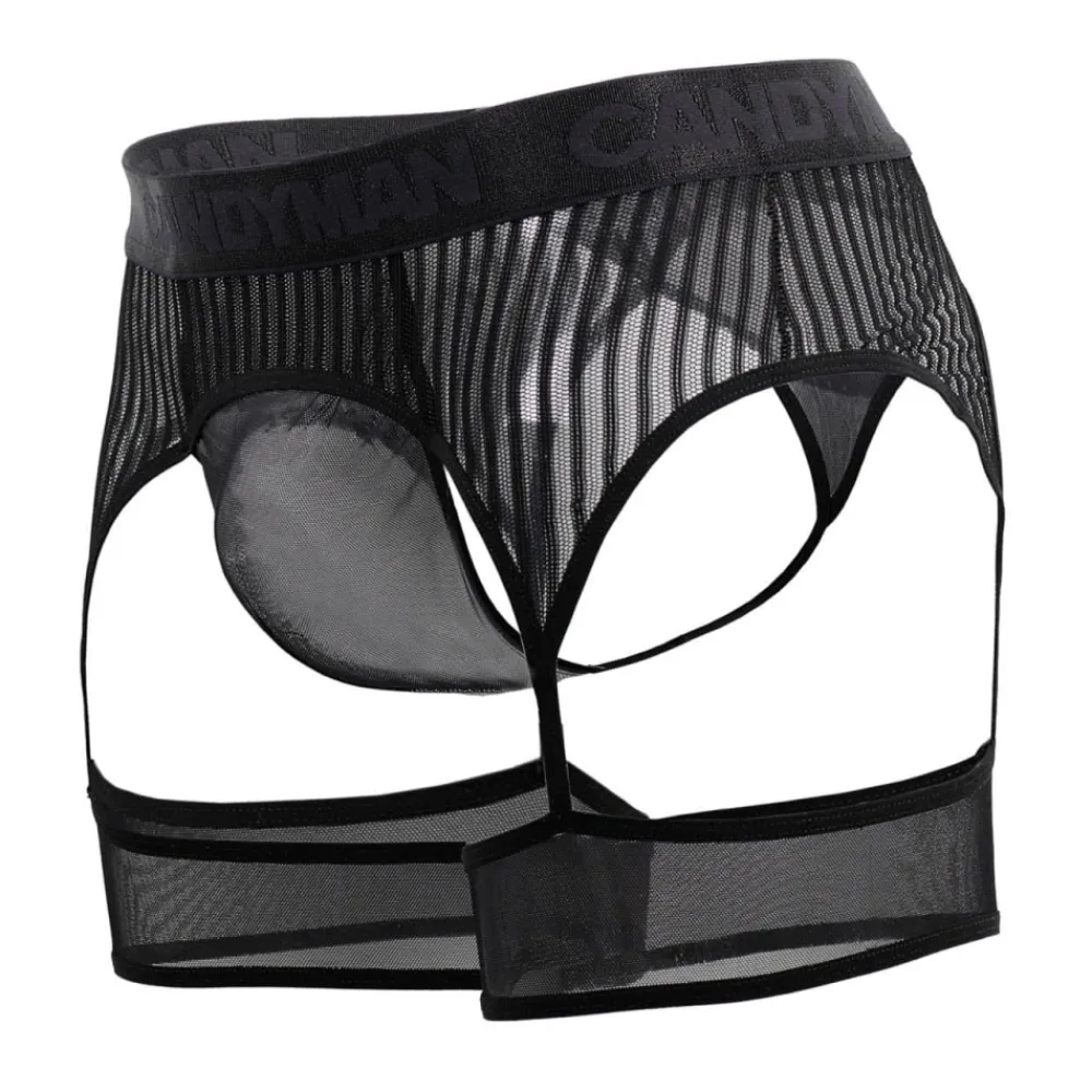 String très sexy en voile transparent combiné à un porte-jarretelle en résille rayée. Jarretières en tulle. Ceinture élastique signée Candyman ton-sur-ton.