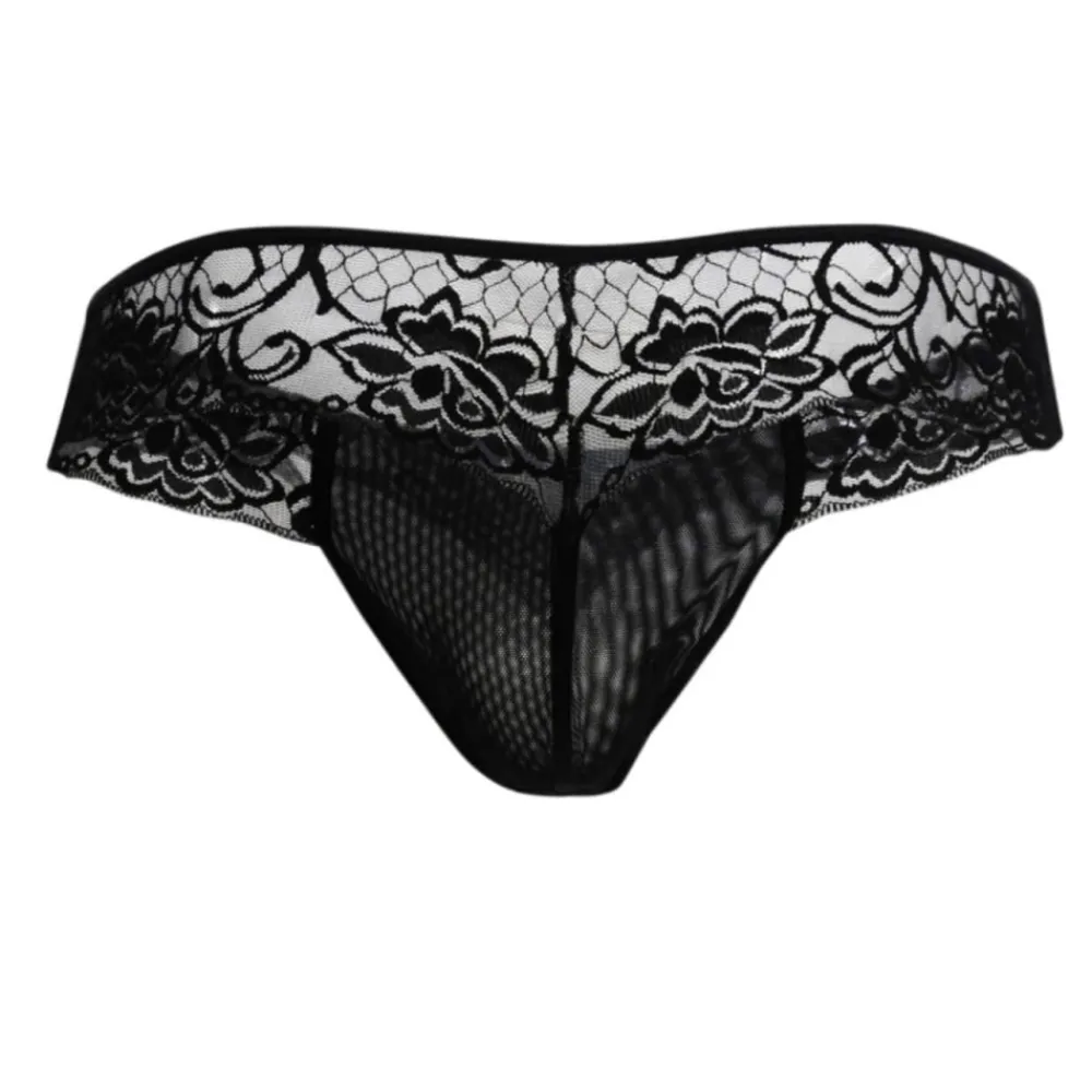 String très sexy en dentelle forale transparente. Poche frontale opaque non doublée en résille.