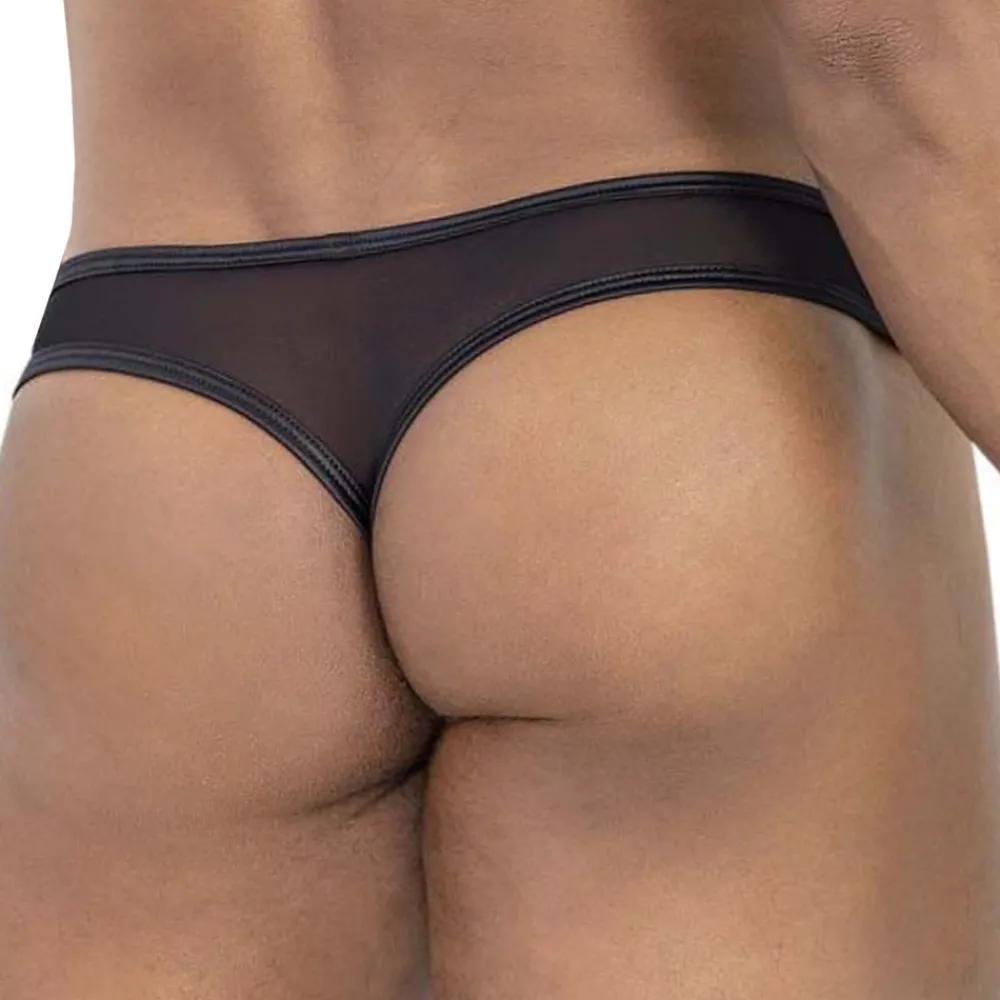 String très sexy en résille douce et totalement transparente. Bordures et bandes sport de couleur contrastée. Poche frontale non doublée. Fine ceinture élastique.