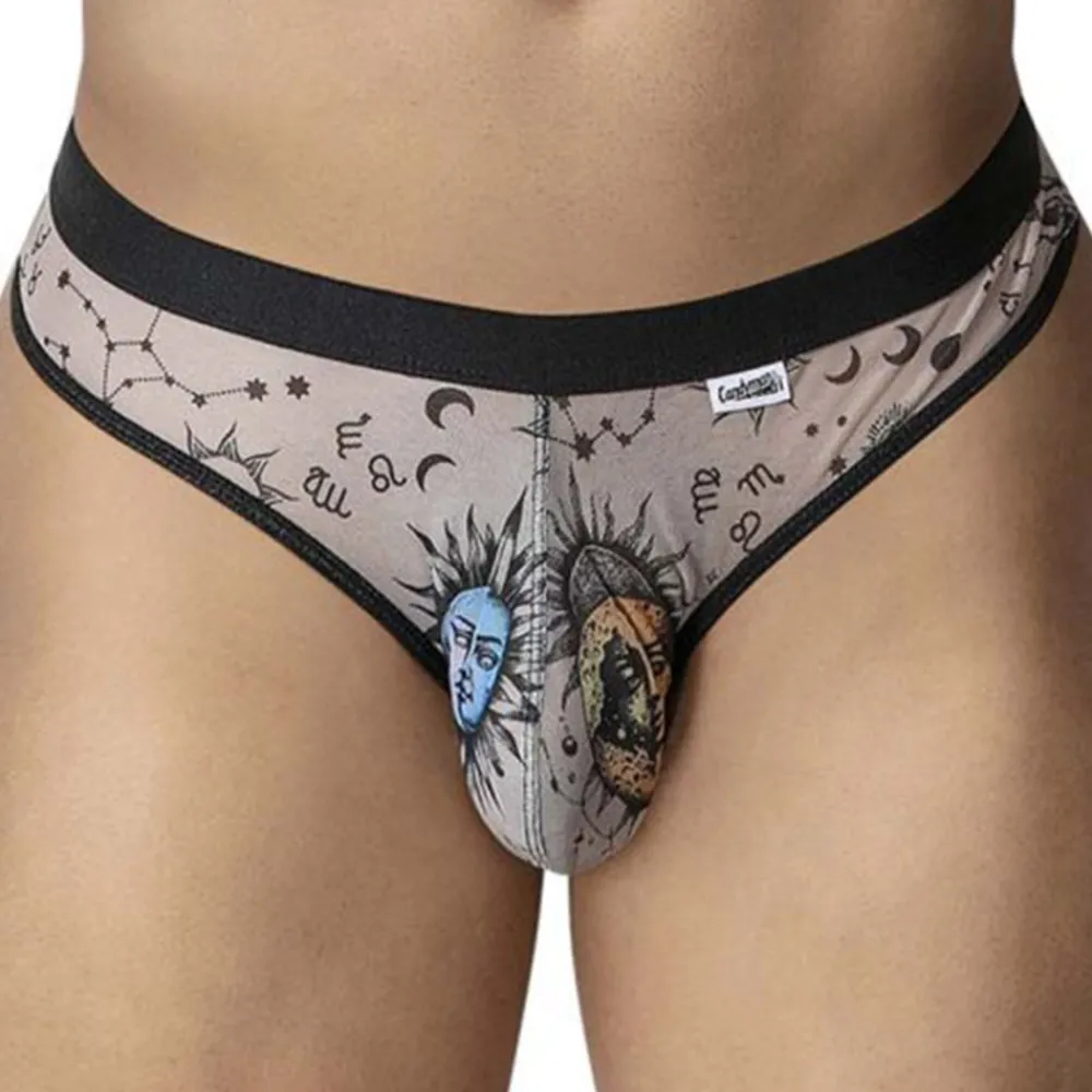String très sexy en résille transparente imprimée d’un motif mystique constitué de soleils, lunes et signes astrologiques. Coupe minimaliste, taille basse et ajustée. Poche frontale préformée, non doublée. Ceinture élastique.