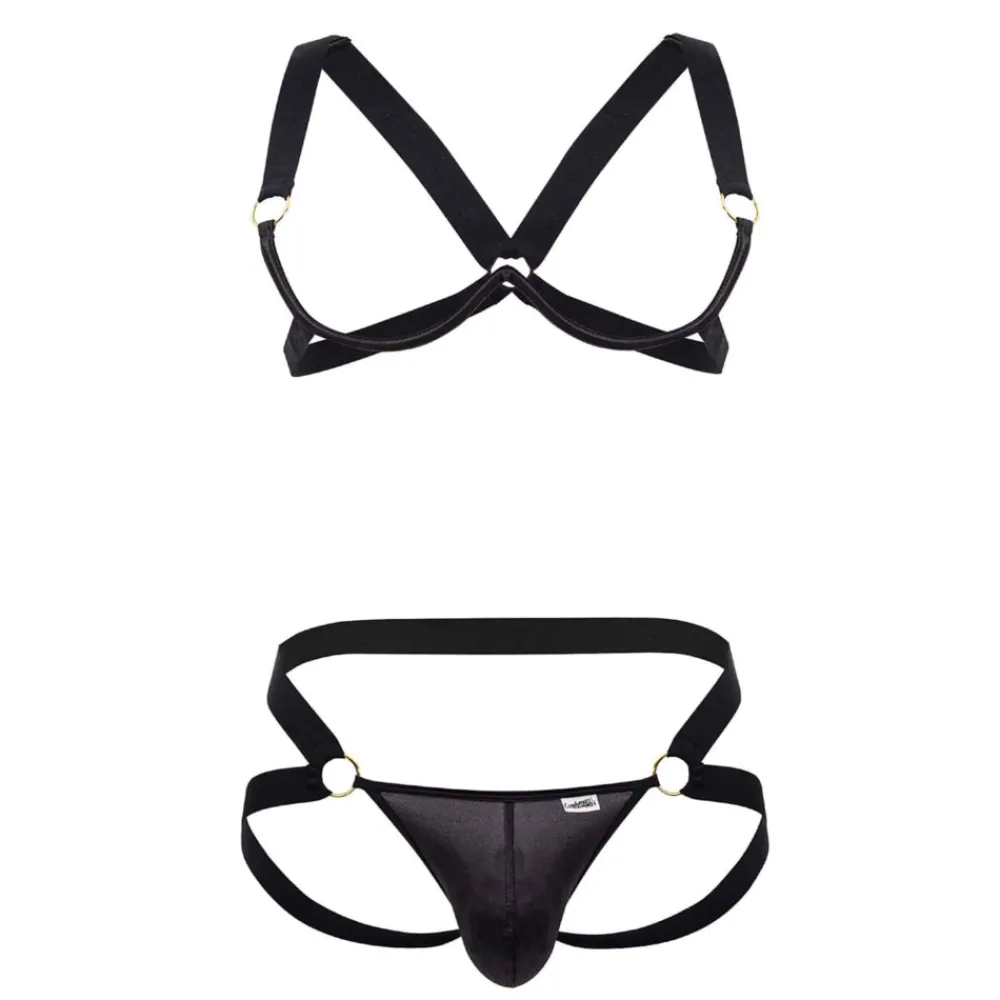 Ensemble sexy et provocant composé d’un harnais soutien-gorge et d’un jockstrap en microfibre extensible. Le harnais soutient la poitrine à l’aide d’une armature rigide. Bandes élastiques reliées par des anneaux métalliques. Bretelles réglables. Poche frontale non doublée.