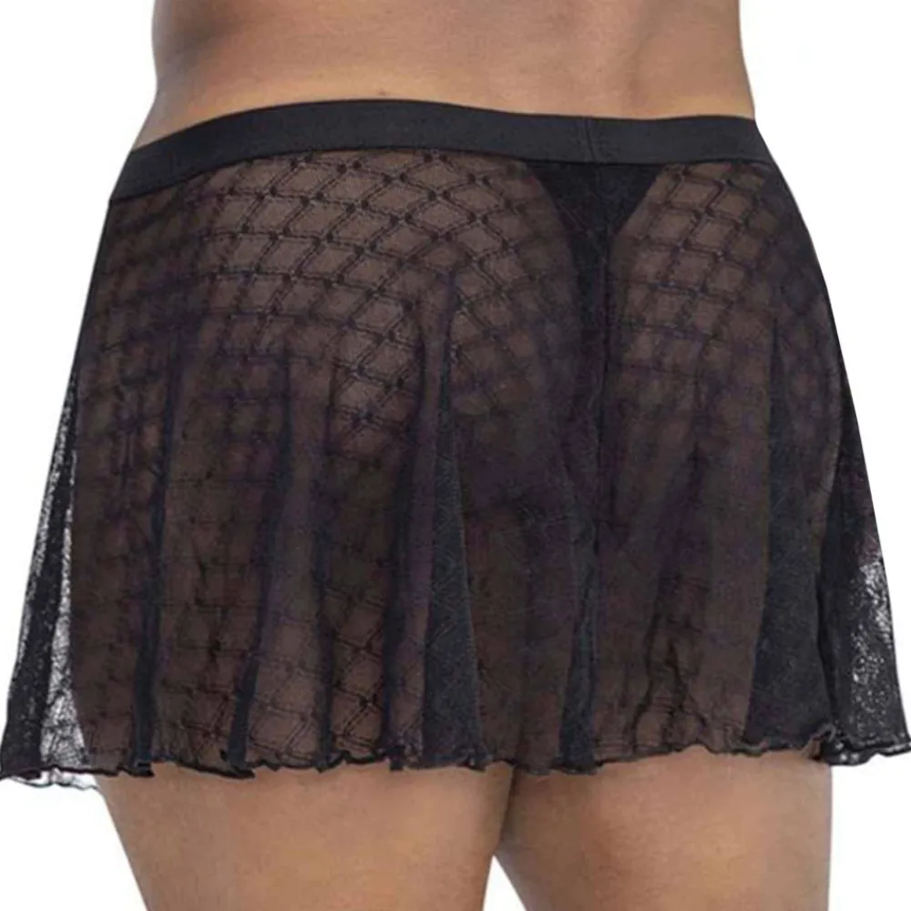 Jupe très sexy en dentelle extensible transparente, ornée d’un motif géométrique. String intérieur en mesh pour plus de maintien et de confort. Ceinture élastique.