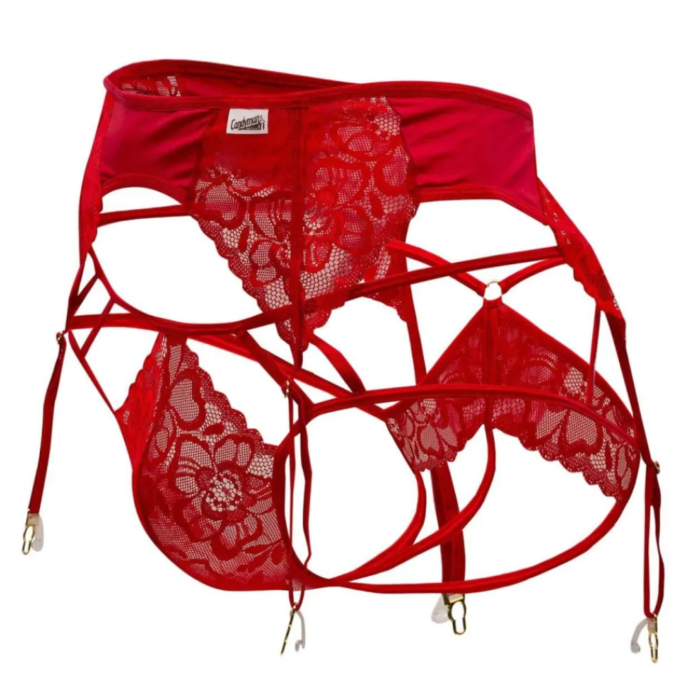 Ensemble sexy et provocant composé d’un porte-jarretelle et d’un jocktrap en dentelle florale transparente. Bretelles fines. Clips métalliques pour attacher les bas (vendus séparément). Jockstrap avec poche frontale non doublée.