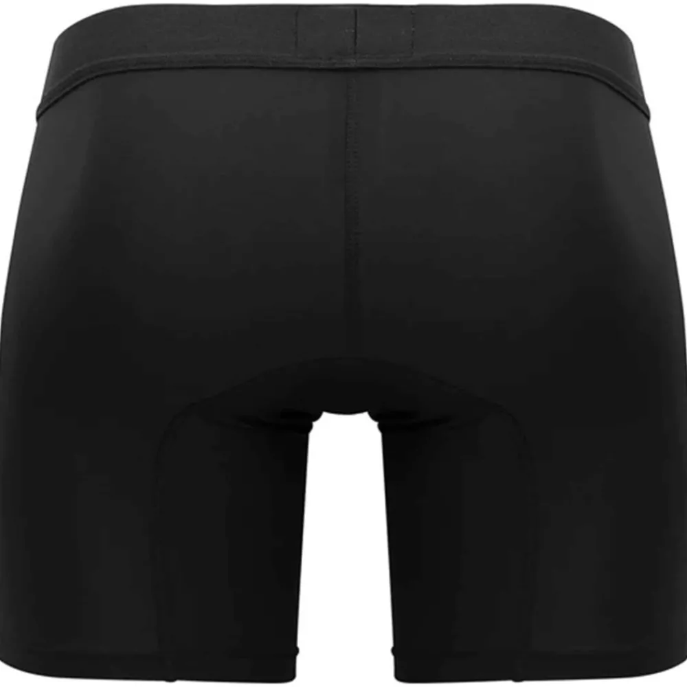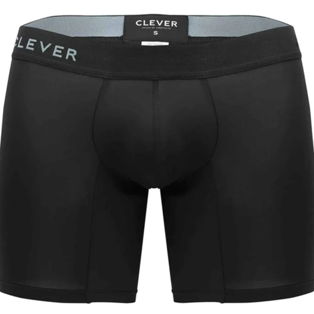 Boxer sport long et ajusté en microfibre extensible, douce et légère, de couleur unie. Poche frontale anatomique enveloppant naturellement votre intimité, pour un maintien très agréable et sensuel. Ceinture élastique signée Clever.