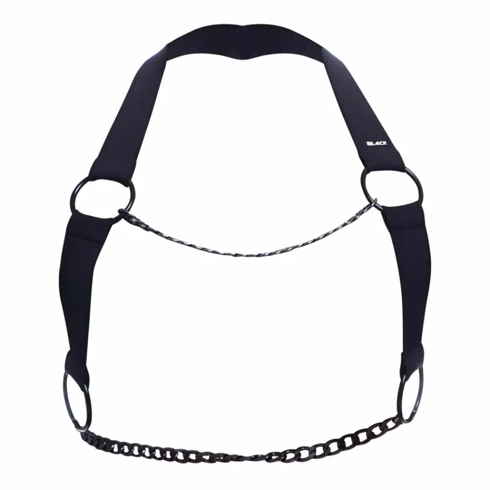 Harnais composé de bandes élastiques passant derrière la nuque. 4 anneaux et 2 chaînes métalliques. Dos nu.