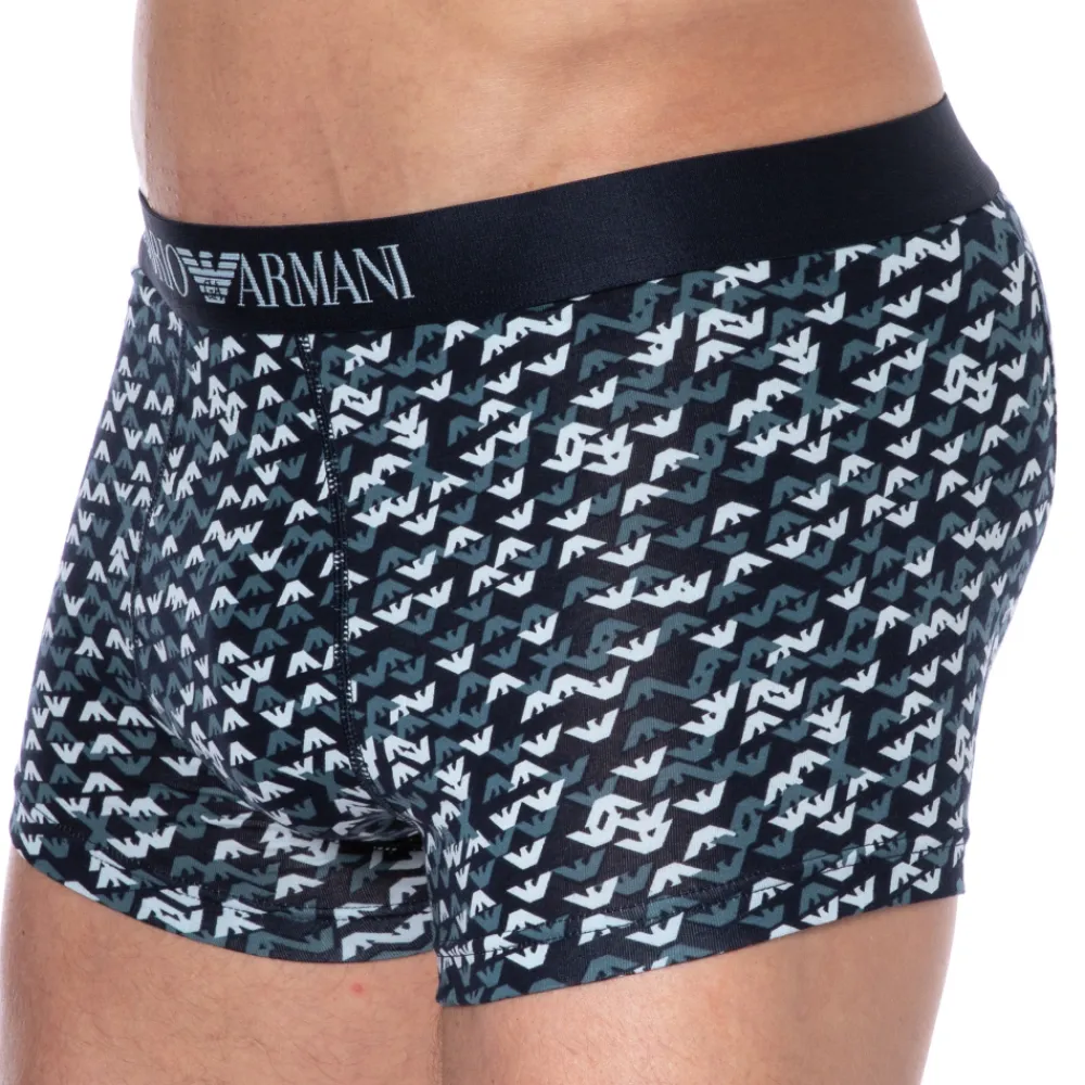 Boxer en coton extensible très doux et confortable. Imprimé allover constitué d’aigles iconiques de la marque. Coupe taille basse, simple et élégante. Poche frontale doublée. Ceinture élastique signée Emporio Armani.