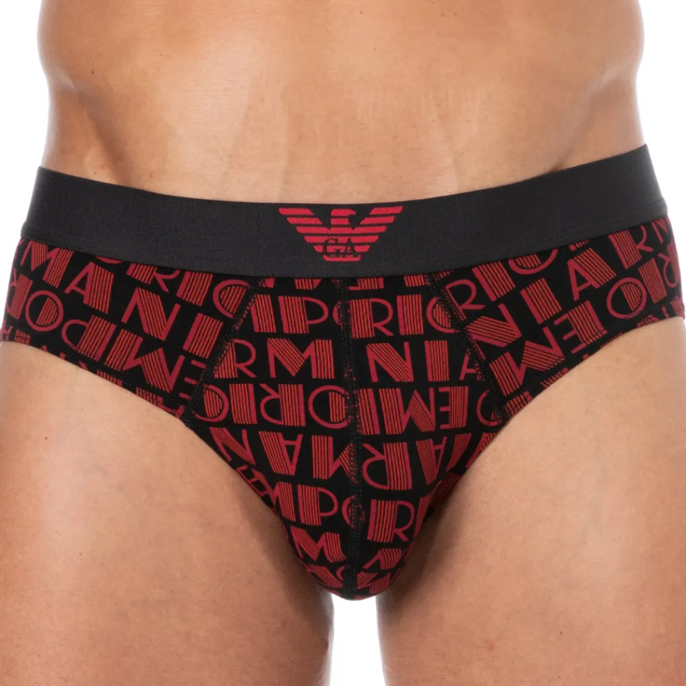 Slip doux et confortable en coton stretch imprimé de logos allover. Poche frontale doublée. Ceinture élastique signée Emporio Armani.