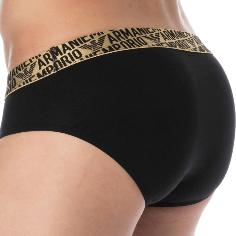 Slip en coton bio extensible, très doux et confortable.Coupe taille basse, simple et élégante. Poche frontale doublée. Ceinture élastique dorée signée de multiples logos Emporio Armani.