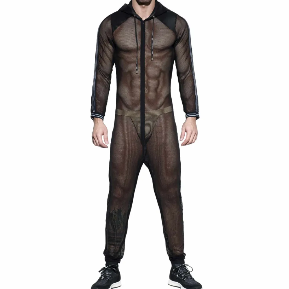 Combinaison ultra sexy en mesh transparent. Bande sport de couleur contrastée le long des manches et sur les poignets. Capuche et épaules en simili cuir. Cordon de serrage. Fermeture Eclair invisible devant.