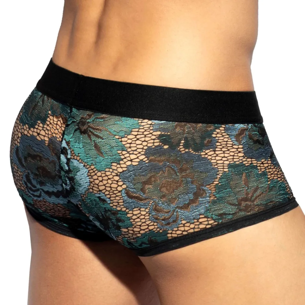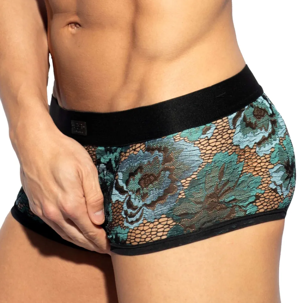 Boxer luxueux en dentelle transparente décorée d’un délicat motif floral dans les tons verts et bleus. Grande poche frontale push up pour un excellent maintien et une valorisation naturelle de votre masculinité. Ceinture élastique signée ES Collection.