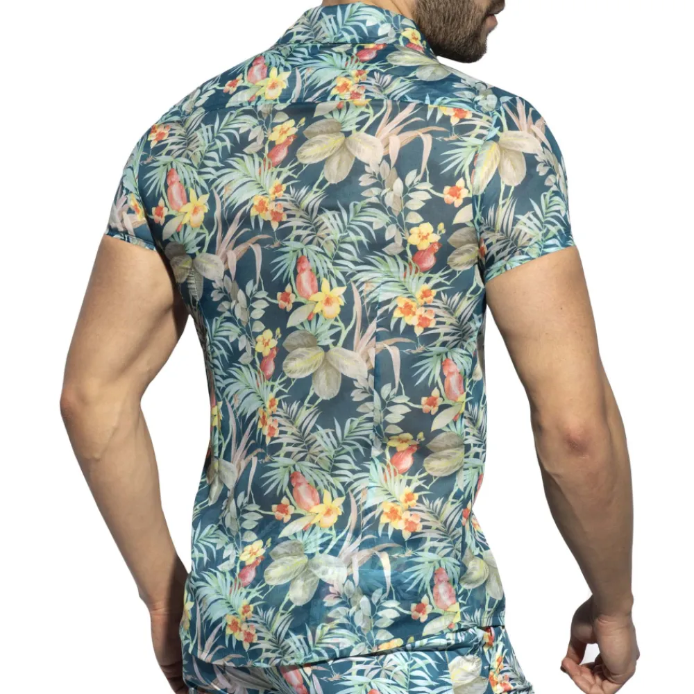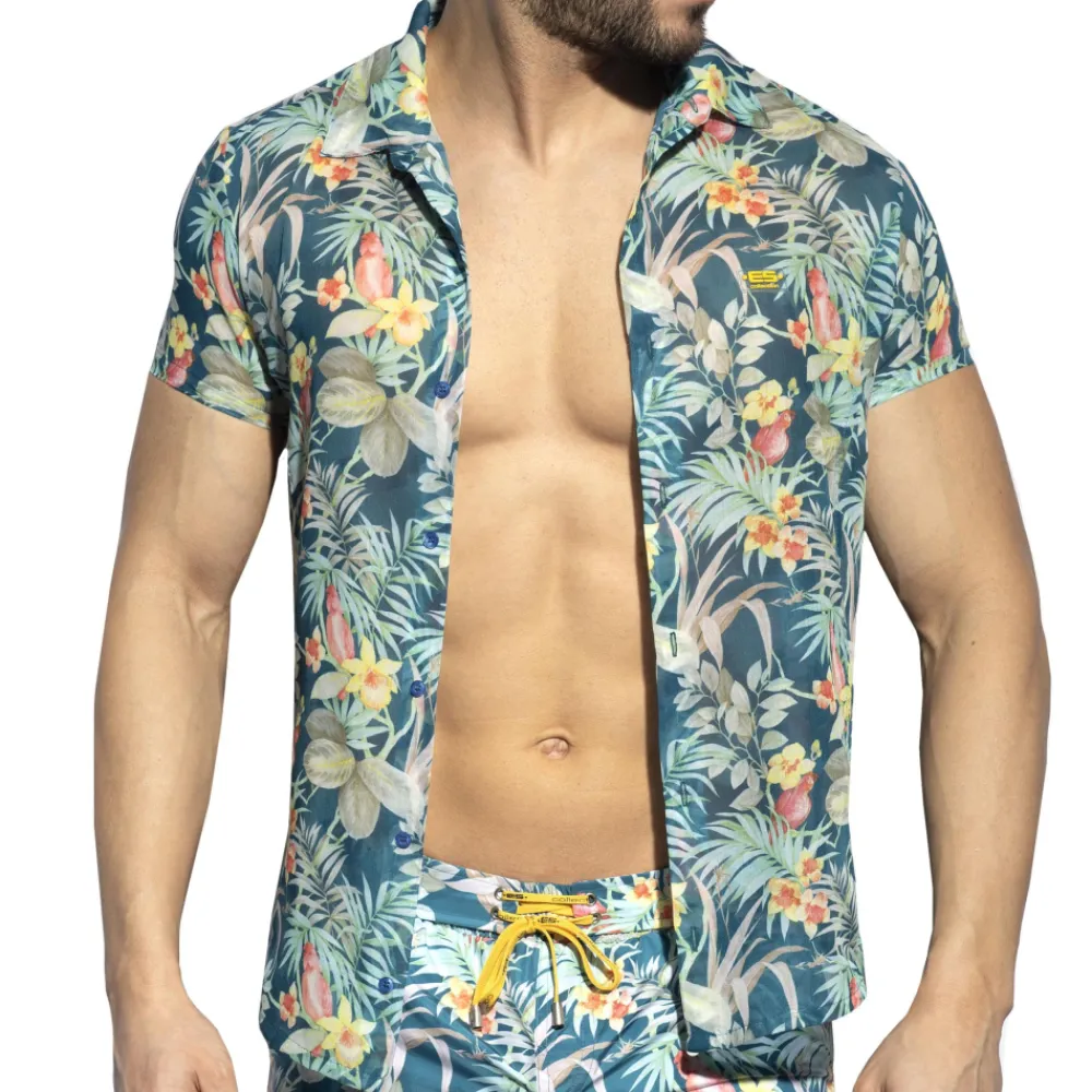 Chemisette cintrée, originale et confortable, en microfibre imprimée d’un motif hawaïen. Fermeture 7 boutons. Logo ES Collection en silicone sur la poitrine.
