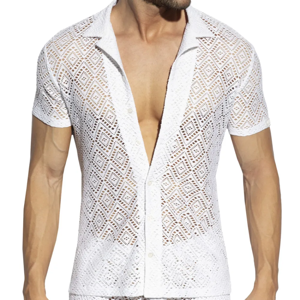 Chemisette cintrée, originale et sexy, en tissu transparent, léger et respirant. Motif géométrique ajouré. Matière recyclée à partir de bouteilles plastique. Fermeture 5 boutons. Logo ES Collection en silicone sur la manche gauche.