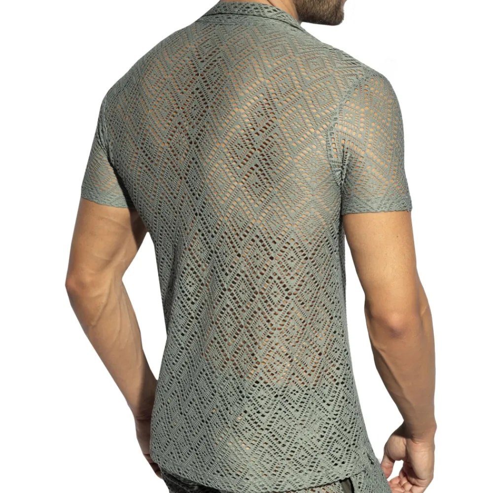 Chemisette cintrée, originale et sexy, en tissu transparent, léger et respirant. Motif géométrique ajouré. Matière recyclée à partir de bouteilles plastique. Fermeture 5 boutons. Logo ES Collection en silicone sur la manche gauche.