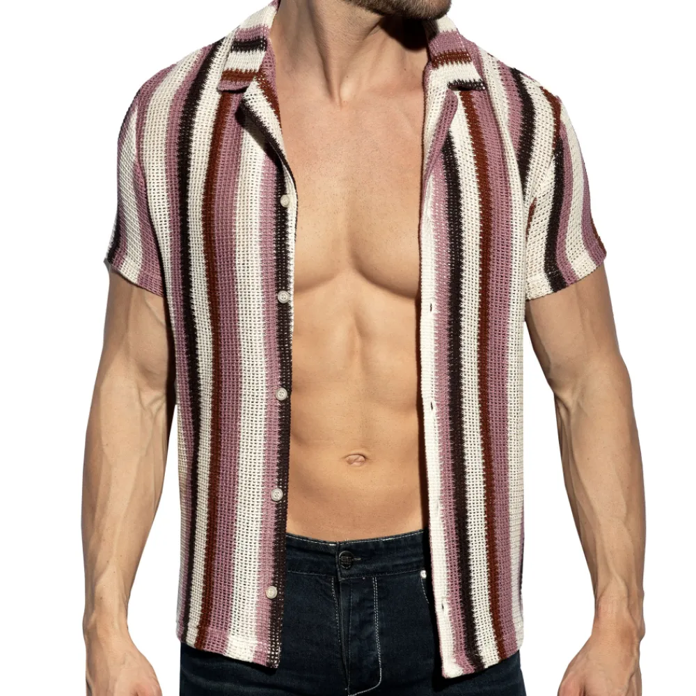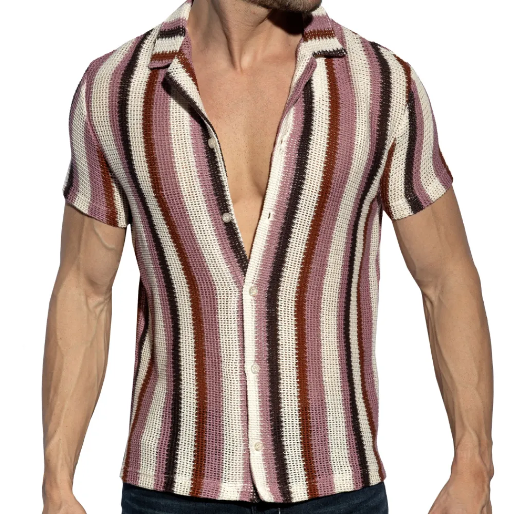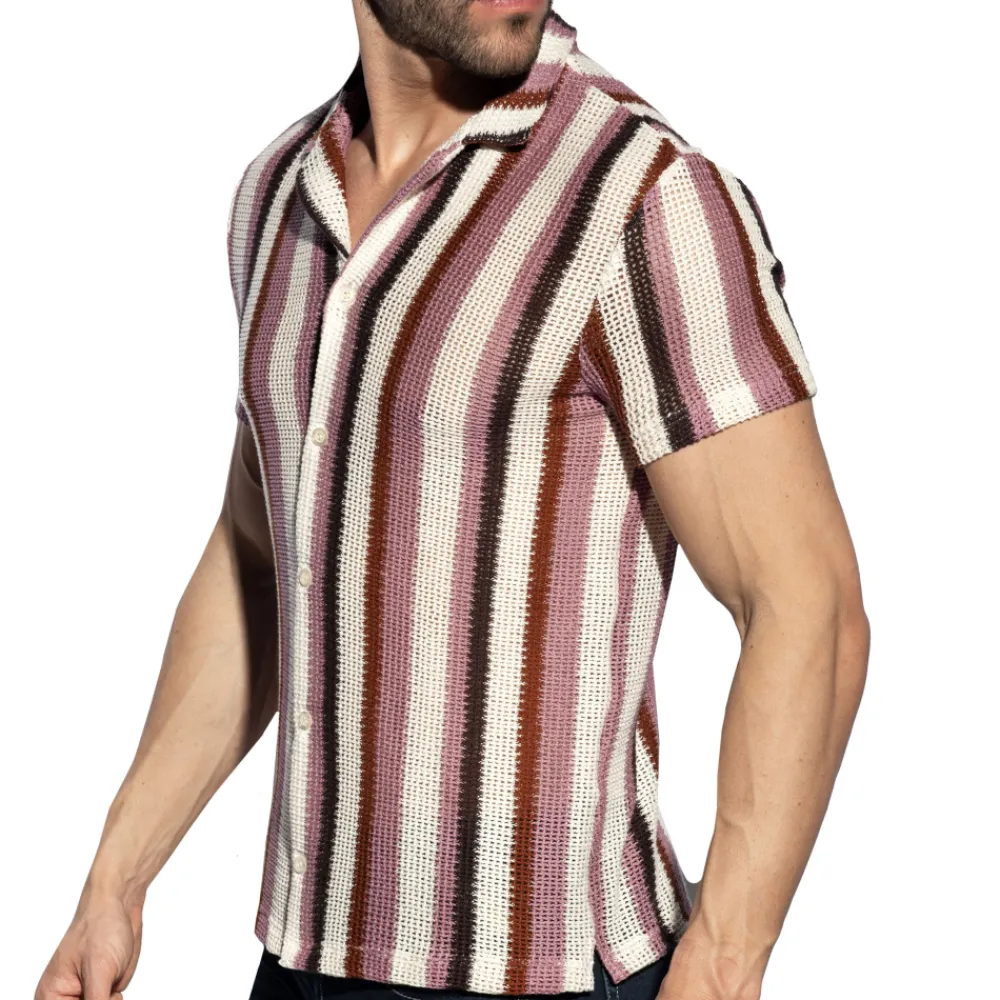 Chemise bohème en coton tricoté à larges mailles, qui ne laisse pas grand chose à l’imagination. Coupe cintrée, col chemise et manches courtes. Fermeture 6 boutons. Etiquette ES Collection en silicone au dos.