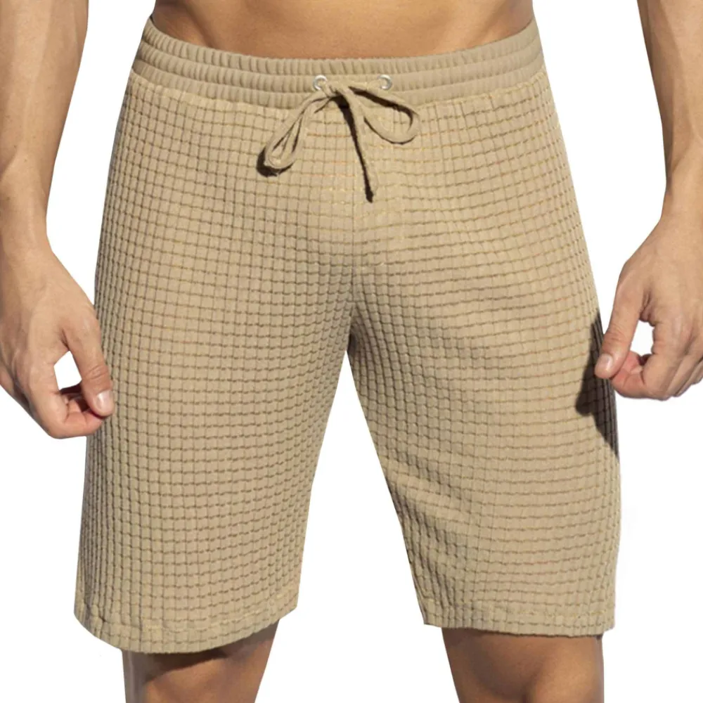 Bermuda à base de coton recyclé super léger, doux et respirant. Matière semi-transparente ornée d’un subtil et élégant motif à carreaux. Logo ES Collection en silicone à l’arrière. Ceinture élastique avec cordon de serrage.