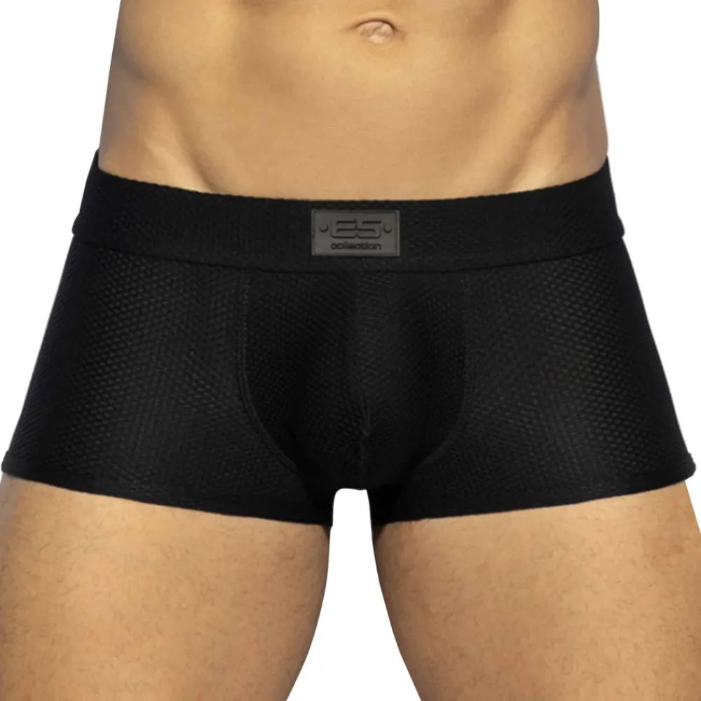 Boxer en mesh extensible, incroyablement doux et confortable. Tissu en relief façon nid d’abeille. Poche frontale de grande capacité. Logo ES en silicone cousu la ceinture élastique recouverte.