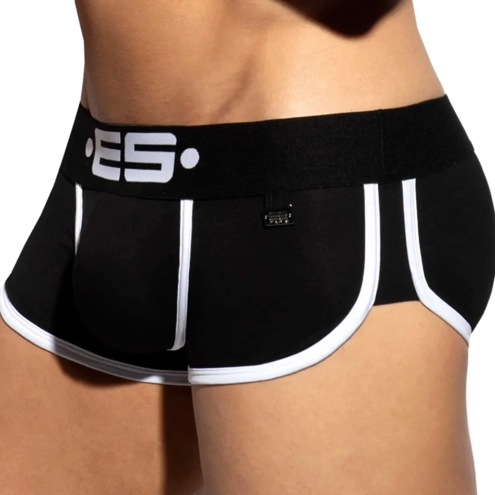 Shorty dont la coupe taille basse parfaitement ajustée a été conçue par Les Dessous d’Apollon. Poche frontale superbement découpée pour un très grand confort. L’échancrure sur le côté est soulignée par une bande de couleur contrastée. Large ceinture élastique signée ES Collection. Plaque métallique ES Paris en Zamak inoxydable.