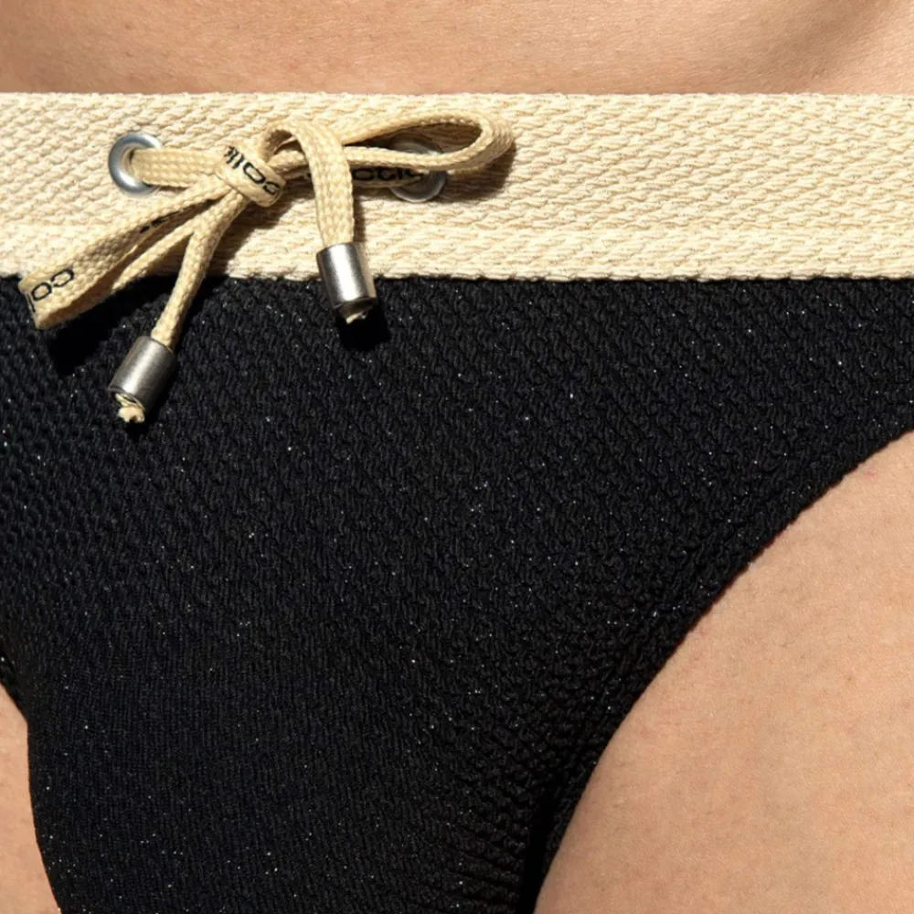 Slip de bain en microfibre texturée contenant des fils métallisés pour un effet pailleté. Poche frontale moulée sans couture pour un confort optimal. Ceinture élastique dorée avec cordon de serrage. Logo ES Collection en silicone à l’arrière.