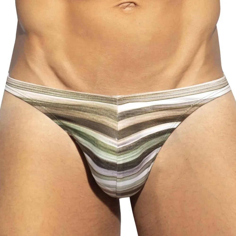 String en microfibre extensible, super douce et légère. Finition satinée avec effet liquide. Rayures horizontales. Coupe bikini taille basse, minimaliste et très ajustée. Grande poche frontale non doublée. Etiquette ES Collection en silicone à l’arrière.