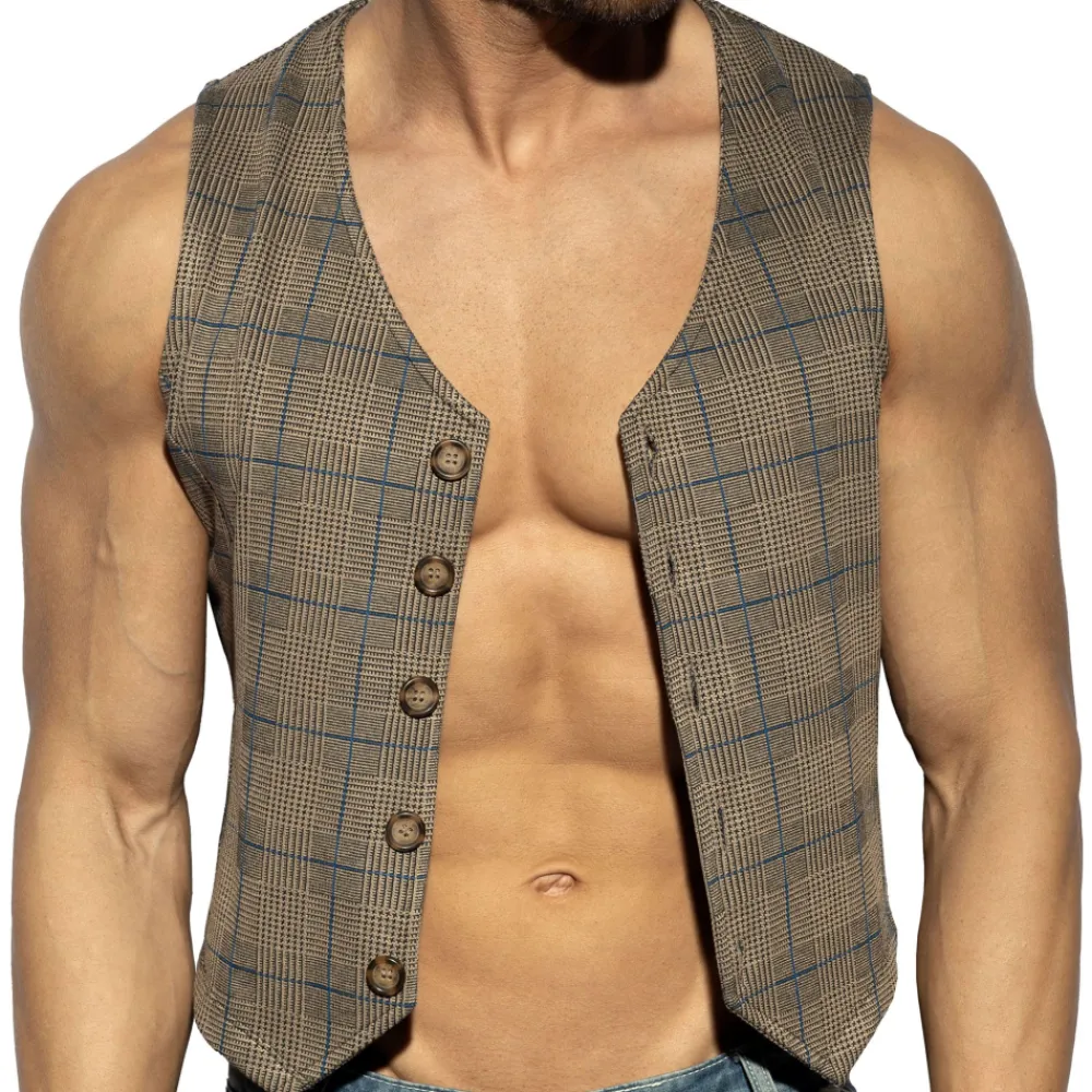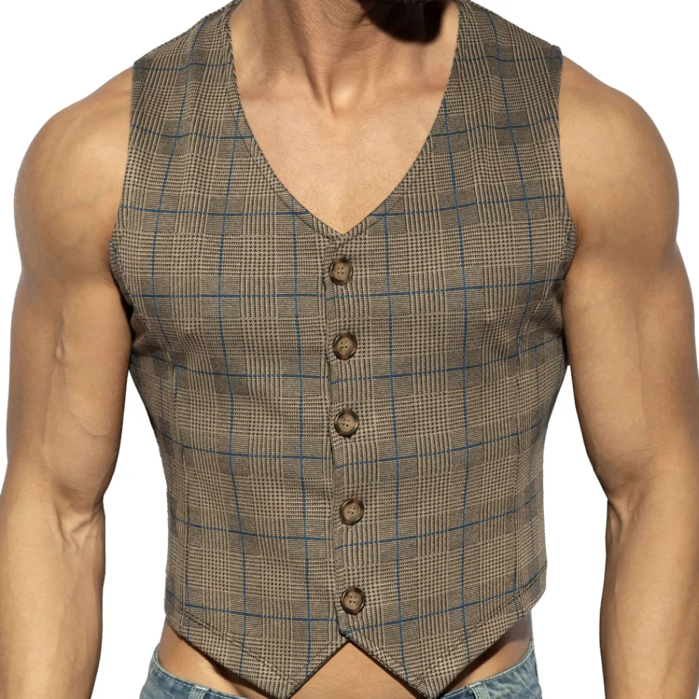 Gilet sans manches, élégant et original, en tissu stretch. Motif tartan très tendance. Coupe cintrée. Fermeture 5 boutons. Logo ES Collection en silicone dans le dos.
