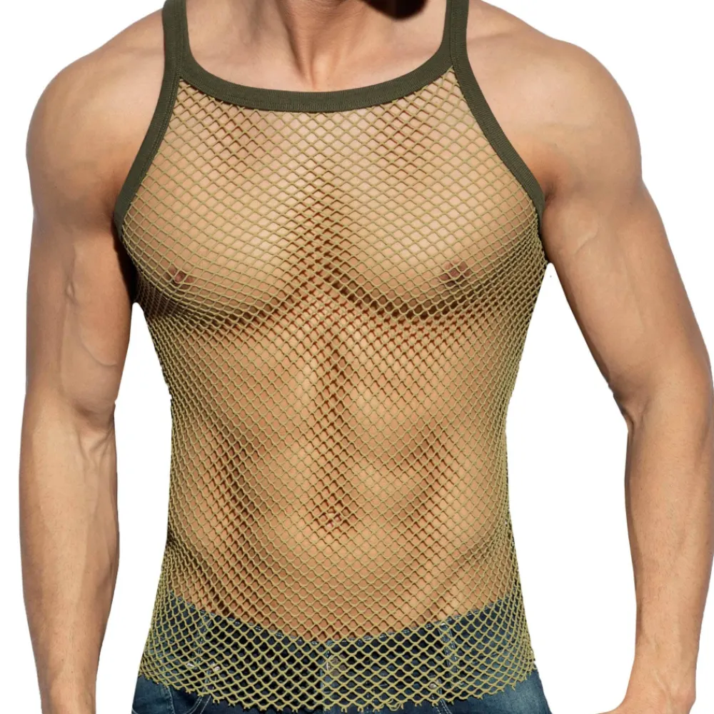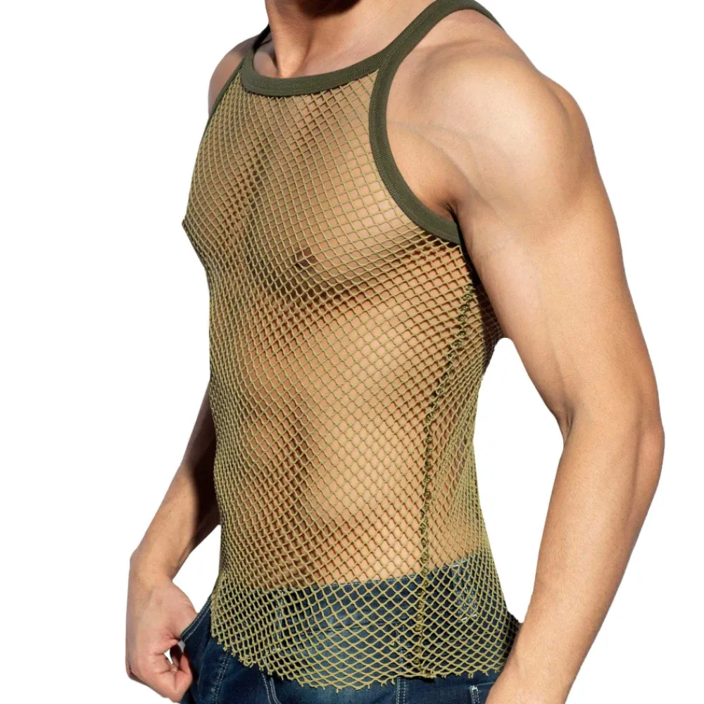 Débardeur très sexy en résille extensible et robuste à maillage large, façon filet de pêche. Coupe ajustée avec col carré. Fines bretelles. Etiquette ES Collection en silicone dans le dos.