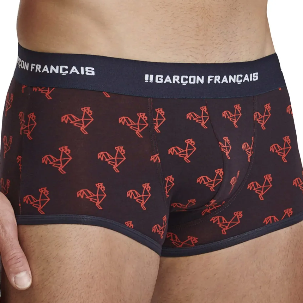 Boxer taille basse très ajusté en coton doux, souple et confortable. Imprimé original constitué de coqs en origami. Belle ceinture Garçon Français. Fabrication 100% française.