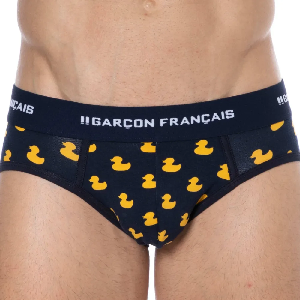 Slip taille basse très ajusté en coton doux, souple et confortable. Imprimé canards très original. Belle ceinture Garçon Français. Fabrication 100% française.