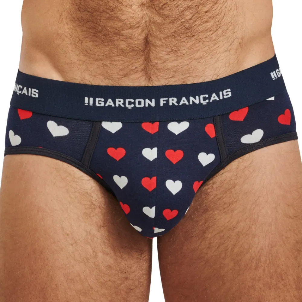 Slip taille basse très ajusté en coton doux, souple et confortable. Imprimé coeur original. Belle ceinture Garçon Français et bordures de couleur contrastée. Fabrication 100% française.