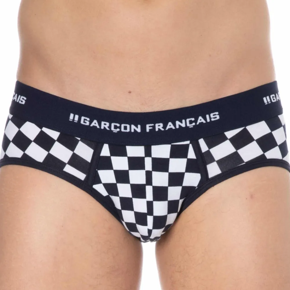 Slip taille basse très ajusté en coton doux, souple et confortable. Imprimé damier très original. Belle ceinture Garçon Français. Fabrication 100% française.