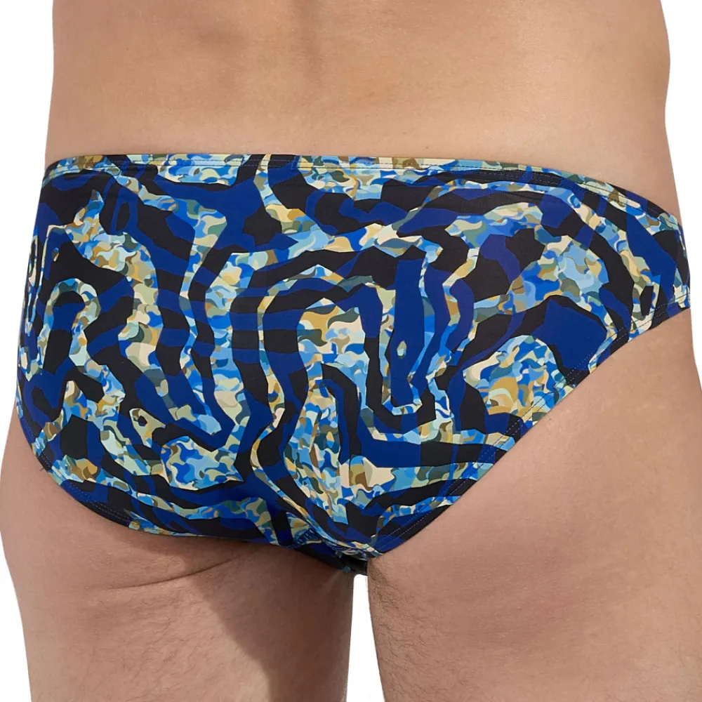 Slip mini taille basse en microfibre extensible ultra douce et confortable. Imprimé abstrait aux formes irrégulières. Poche frontale doublée. Ceinture élastique fine avec étiquette HOM cousue sur la hanche gauche.