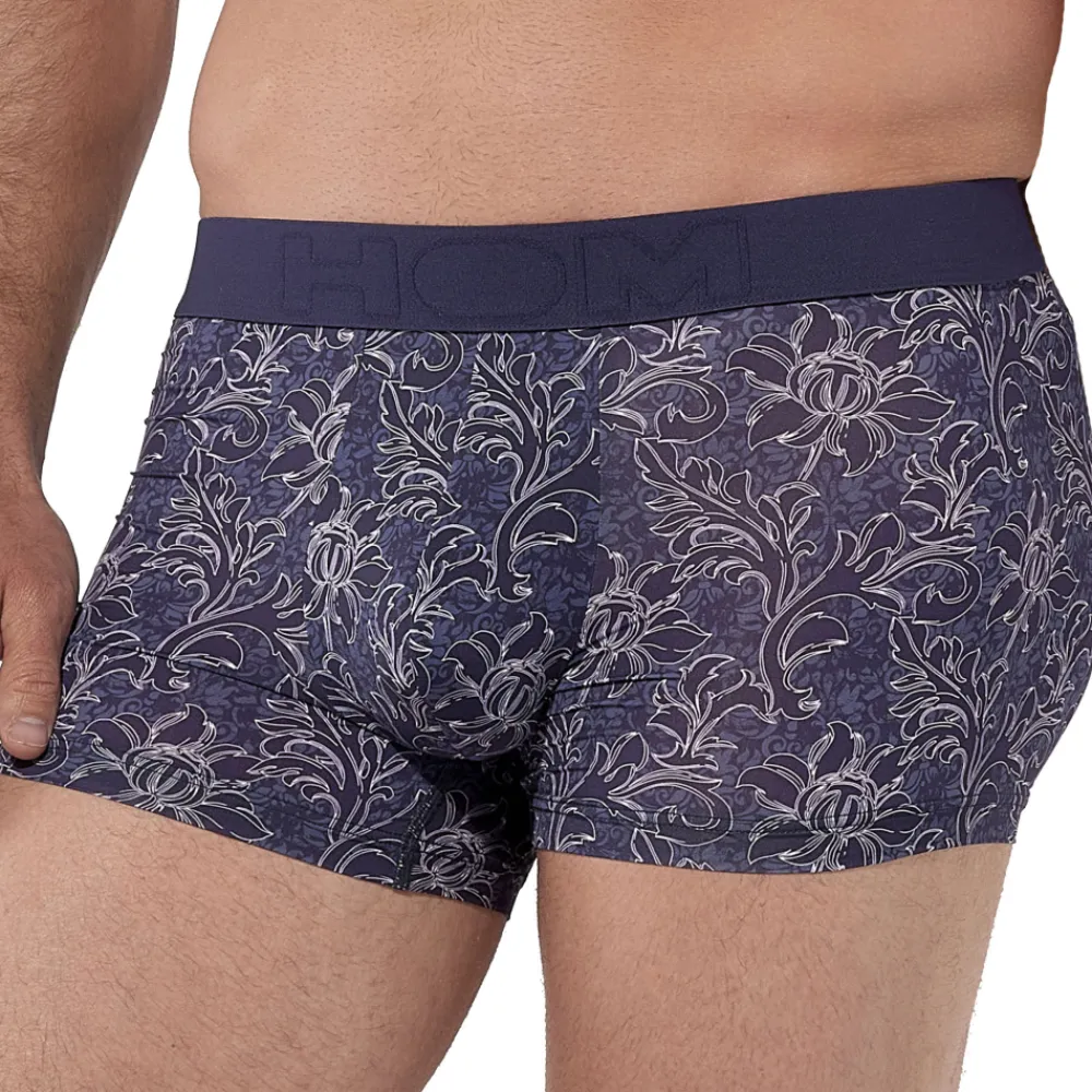 Boxer sensuel et luxueux en microfibre douce et ultra légère, pour un effet seconde peau. Imprimé floral stylisé aux contours blancs et motifs baroques en camaïeux de bleu,. Poche frontale doublée. Tissu de qualité supérieure certifié Oeko-Tex. Ceinture élastique signée HOM.