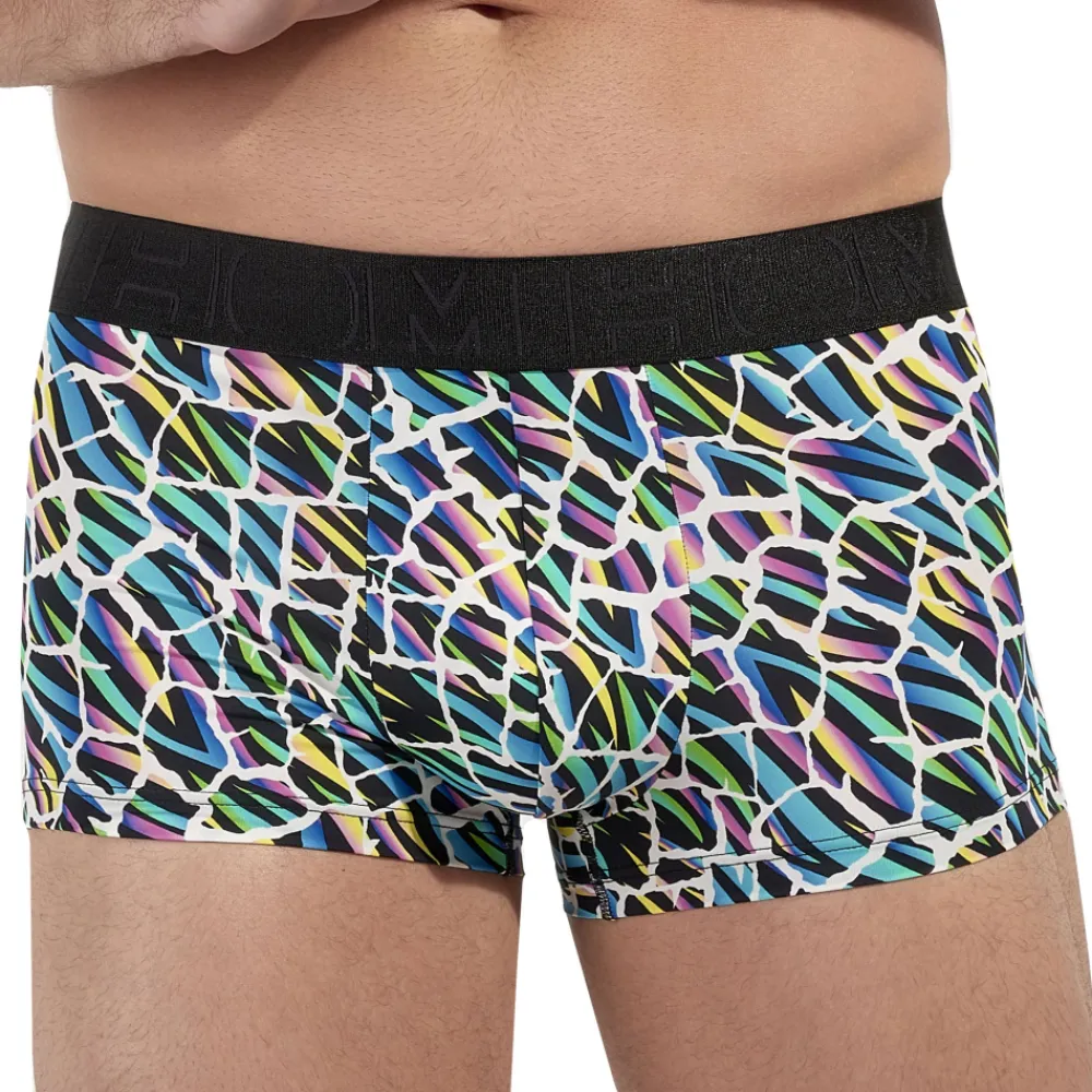 Boxer taille basse en microfibre extensible ultra douce et confortable. Imprimé abstrait multicolore. Poche frontale doublée. Ceinture élastique signée HOM.