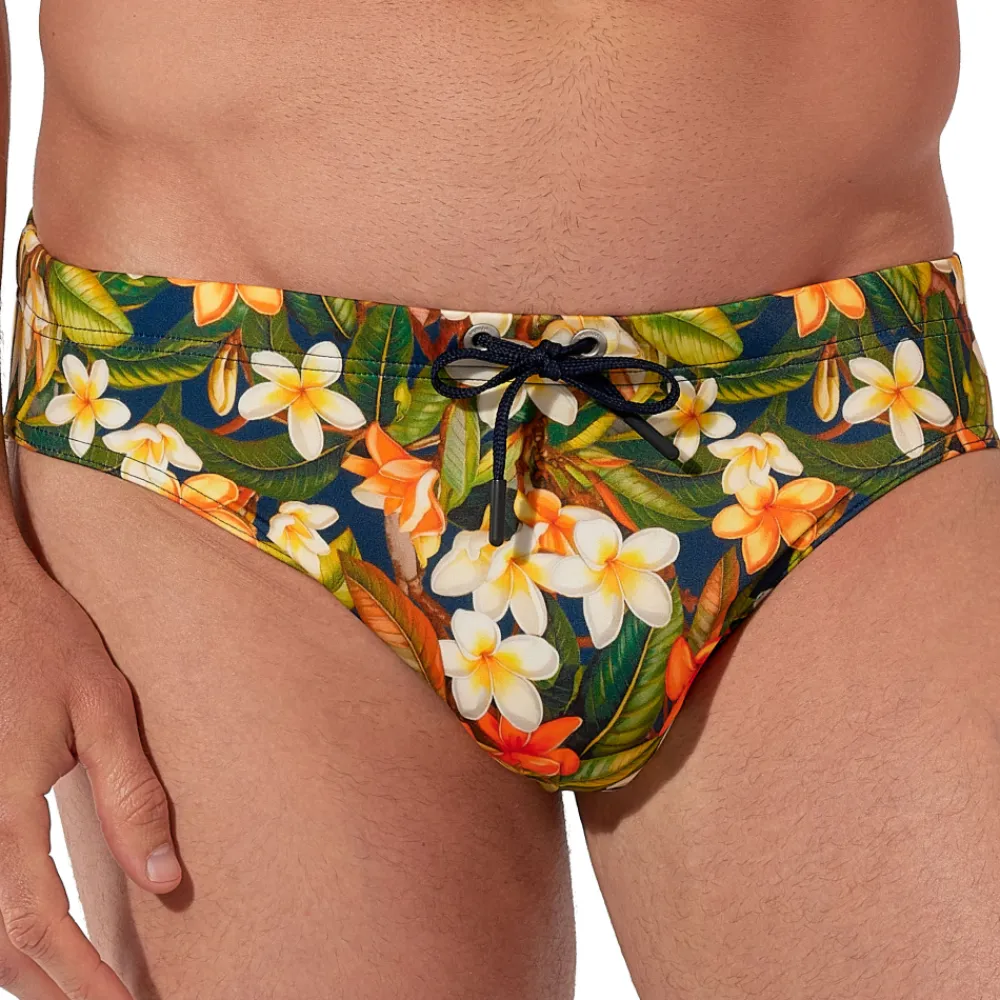 Slip de bain confortable en microfibre italienne. Imprimé floral vibrant dans les tons orangés sur fond bleu marine, évoquant la végétation luxuriante de la Sicile. Poche frontale doublée. Ceinture élastique avec cordon de serrage. Etiquette HOM à l’arrière.