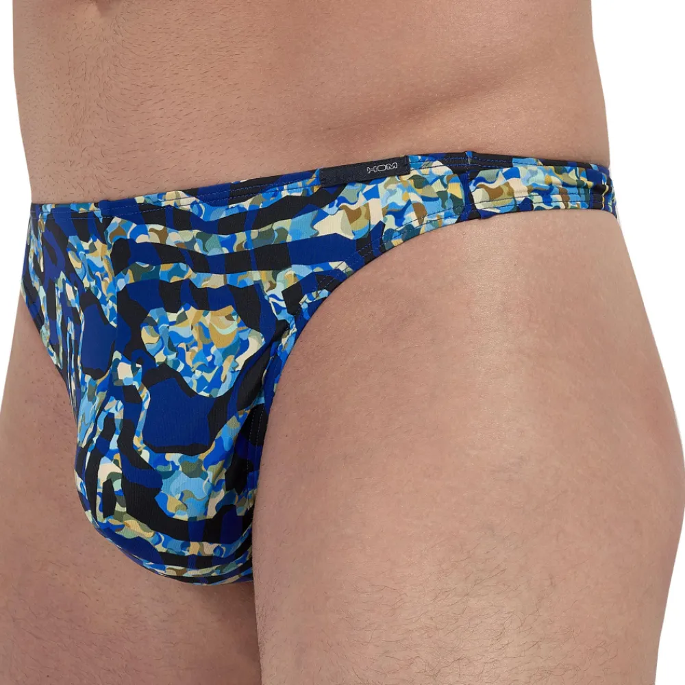 String sexy et original en microfibre extensible ultra douce et confortable. Imprimé abstrait aux formes irrégulières. Poche frontale doublée. Ceinture élastique fine avec étiquette HOM cousue sur la hanche gauche.