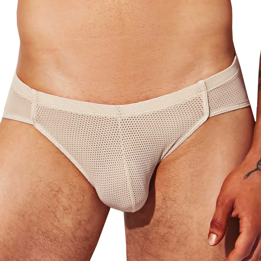 Slip en résille super extensible, douce et respirante de couleur unie. Coupe super taille basse dessinant un V. Poche frontale préformée non doublée. Processus de fabrication respectueux de l’environnement. Fine ceinture élastique recouverte.