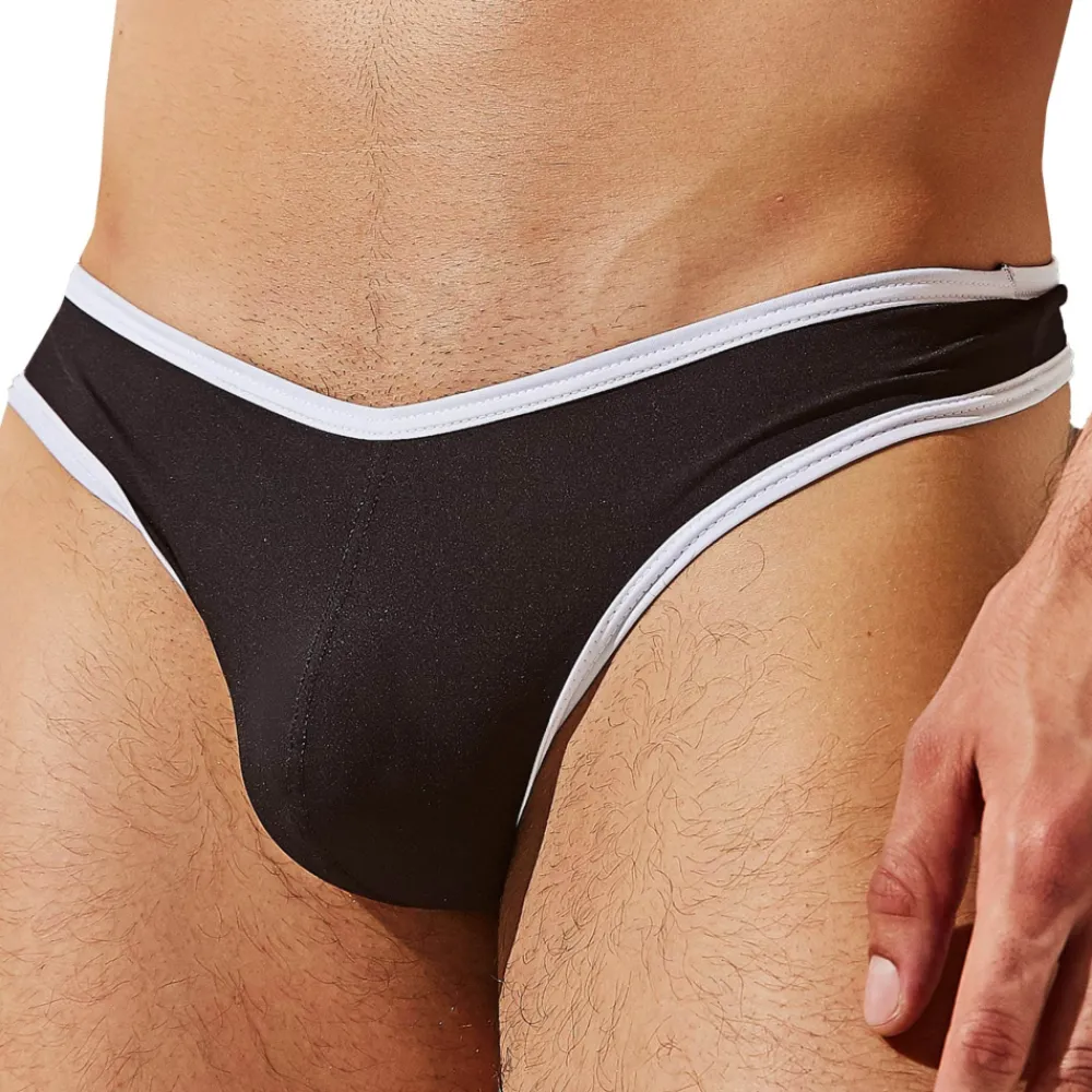 String en microfibre douce et légère. Coupe taille basse et minimaliste. Ceinture élastique fine et bordures de couleur contrastée.