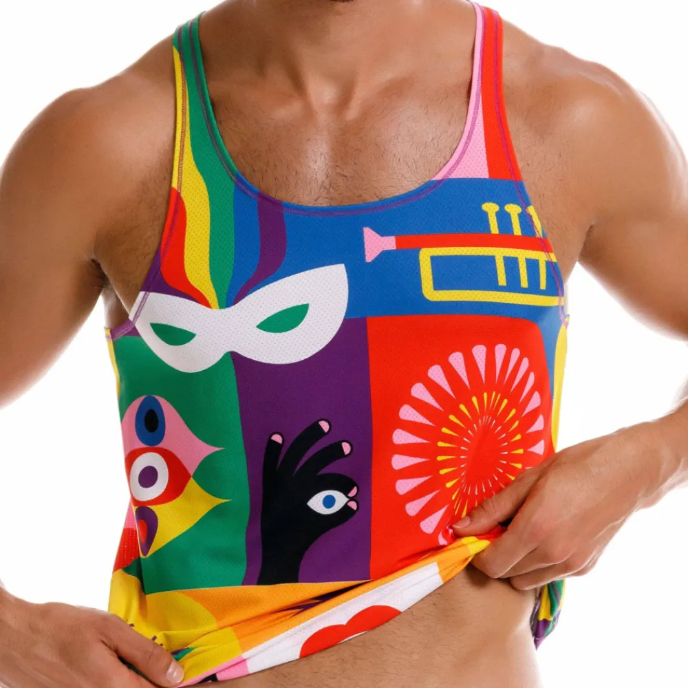 Débardeur en microfibre extensible, super douce et légère. Imprimé festif évoquant le carnaval.