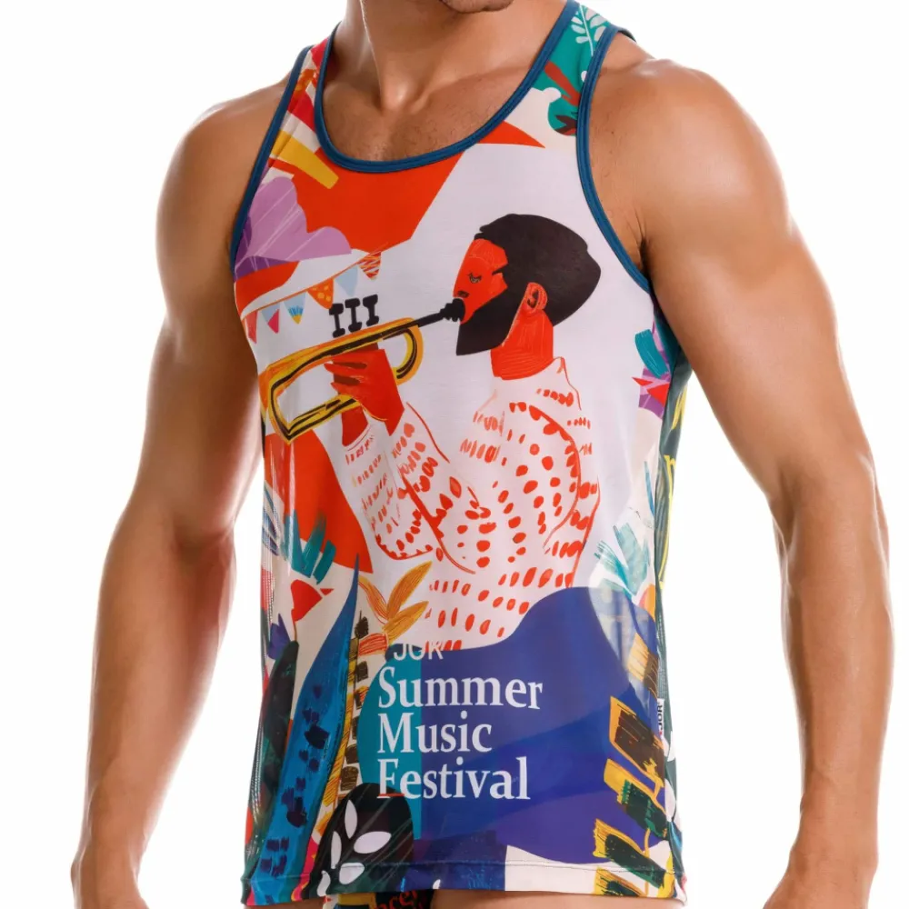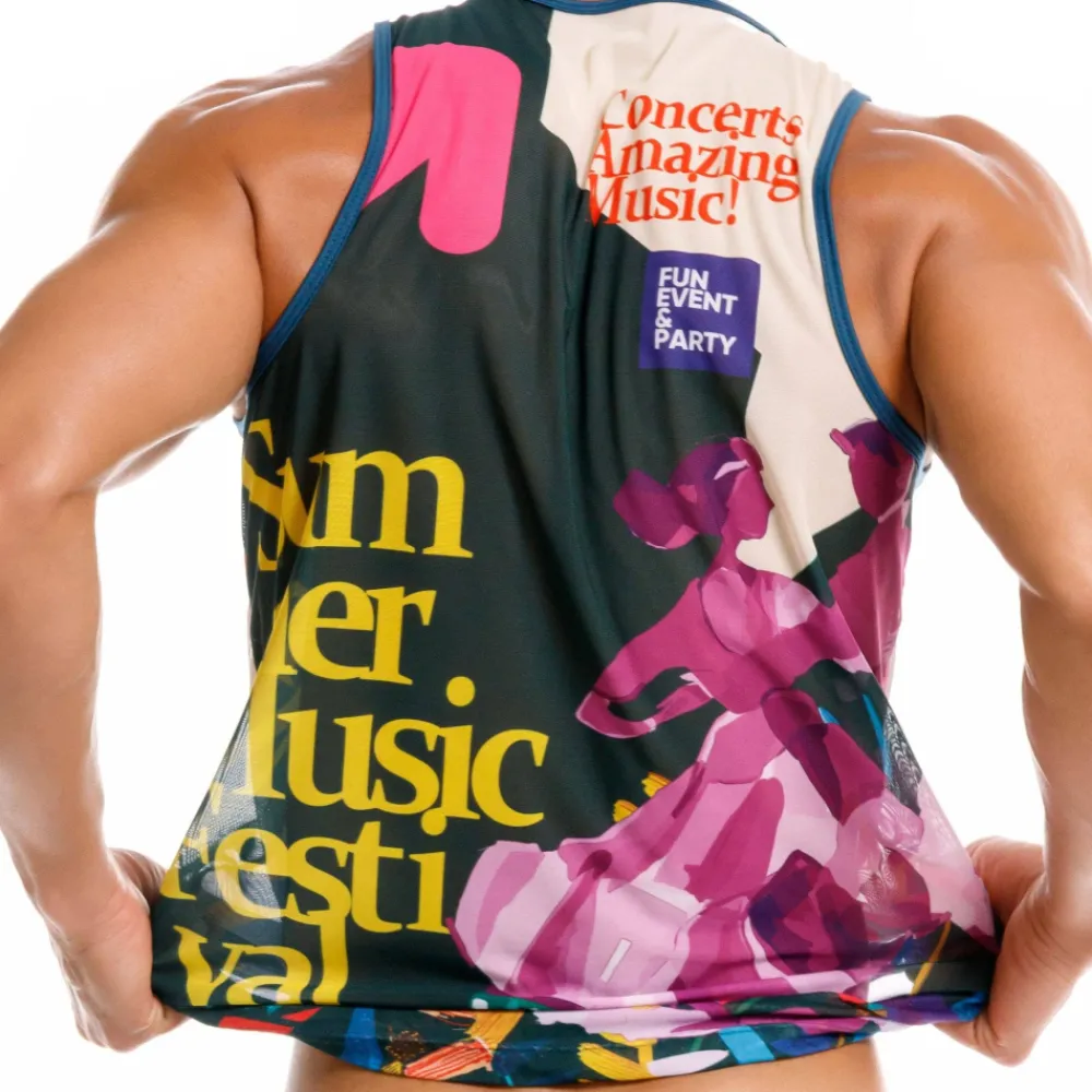 Débardeur semi-transparent en microfibre extensible, super douce et légère. Imprimé festif évoquant les festivals musicaux de l’été.